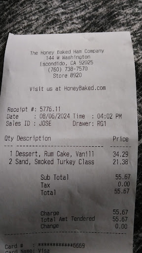 Read moreI'm a Honey-Baked Ham customer from Chicago, who moved to San Diego less than 4 years ago. I picked up a half ham a couple years ago for a Holiday, but it seemed so far away. Now that I'm used to locations I saw the store again and popped for sandwiches and then again. Most recently, I had the pleasure of being helped by Maribel and Ismael, both very professional. I was greeted warmly as soon as I walked in the door and there we're other customers, so I expected to wait my turn. The two of them worked so proficiently together, so no customer felt neglected. Ismael was taking orders and answering general questions, while Maribel was beginning to prepare our orders. I felt so comfortable and was at ease making conversation with the other customers. Very friendly environment. I attribute that to your well-trained competent employees and the people who were knowledgeable about who to...