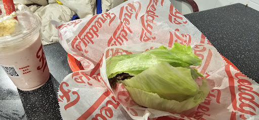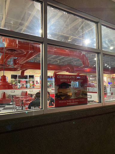 Read moreFreddy's facility looked very nice and clean. Customers service ok, very busy inside and out lots of people! We figure we try out this New Burger joint. Disappointed!!! Our burger was greasy and the thinnest Patty ever, bun fell apart, the sauce which is called Freddy's sauce, we decided to give it a try and.. it ..was ..yuck! We were told no mustard and ketchup those were by the fountain drink. You have to order a Double Freddy's burger to get lettuce and tomatoe, and if you want bacon with cheese again no tomatoes and lettuce those are extra. The fries looked like the Fry sticks that come in a can like a tooth pick. (Needs improvement on menu...) As for the Desserts can't really say anything about em..but they looked good.