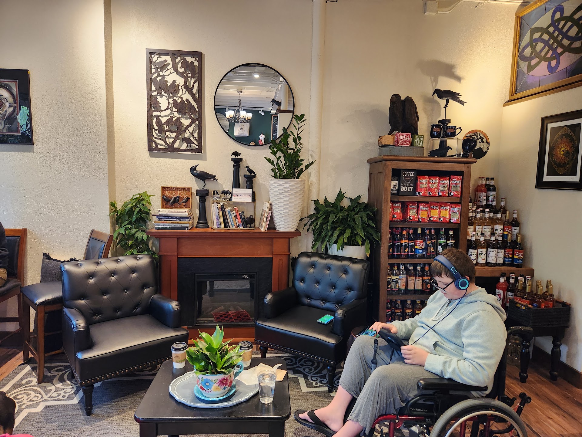 The only thing I would change is this - There are card games and board games for patrons to borrow while there. Currently they are on the fireplace mantle. We were sitting in the 2 chairs in front of the fireplace, so people kept stepping over our stuff to get to the games as we were in their way. It was awkward for everyone. Maybe move the games to the table to the right of the front door, and put the raven décor that is on the table, on the mantle? Tyler is very good at making coffee foam look pretty. I think it is called...