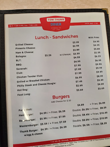 Read moreLooking for a cup of coffee we saw the Tom Thumb Diner and stopped. Small quaint diner with 4 tables and a counter with bar stools. We drank our coffee â then decided to try the special of the day, chili and grilled cheese sandwiches. The meal was good, the service was friendly and the locals that evidently come to eat and talk every day was entertaining. We sat at the counter and I thoroughly enjoyed watching the sweet Lady cooking on the grill. She definitely has it down to a art. There was nonstop customers which tells me this is a popular place. We will be back when in that part of...
