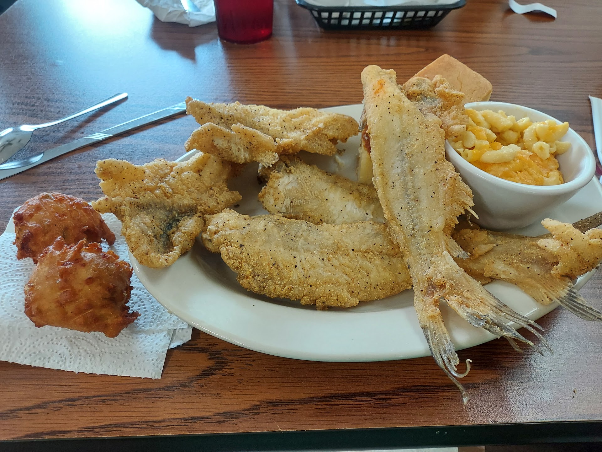 Ā Ā Ā Read moreI had the 5 piece catfish plate and my husband had the small bbq pork plate. The servings were so big we had enough for dinner too. The catfish was some of the best I've ever had!! The plate came with 3 whole fish and 2 fillets plus 2 sides. I actually liked the whole fish over the fillets...the coating was so light you could really taste the fish. We had a late lunch...service was excellent and our food came out quickly. We are just passing thru the area but planning on going again before we leave. Update: we went back several days later...got same main dishes with different sides and it was just as delicious as...
