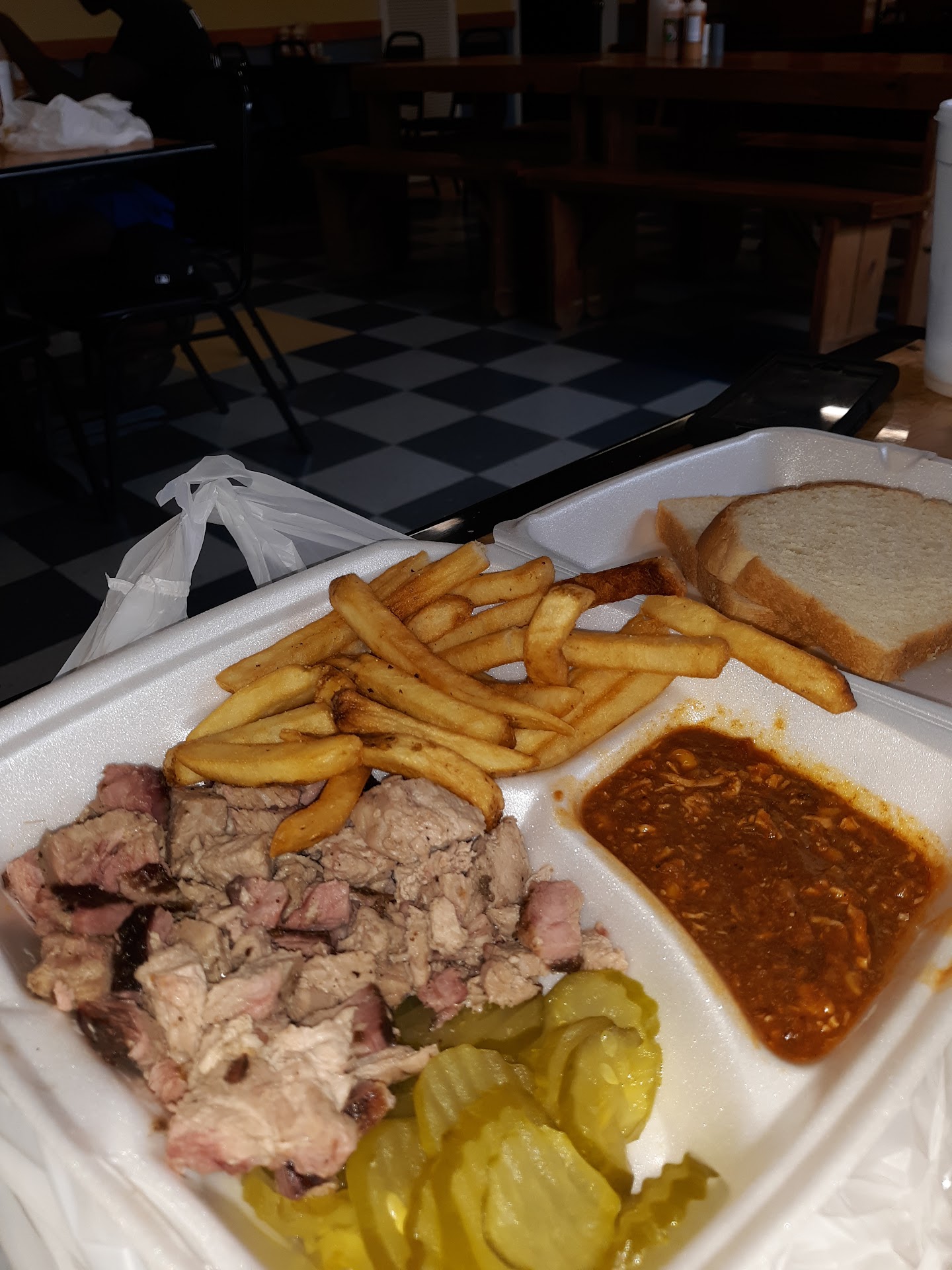 Read moreThis was really a nice find. I have tried other BBQ places in the area and was really disappointed. This place is good. Tried the ribs, chicken, chopped pork. Chipped pork, coleslaw, potato salad, BBQ beans and pecan pie. Ok let me start with Potatoe salad.. wow sour cream and bacon, this was excellent, slaw was home made and pretty good, not too sweet so it offset with BBQ real good. The beans were excellent and had some pork in them. The BBQ was SMOKED as it should be ribs could have been just a tad more tender but it was way better than most. I recommend either CHOPED OR SLICED PORK, I was not a big fan of the "Chipped pork"... it seemed more like cutting board scraps.. They predominantly use a mustard based sauce which was good, I prefer ketchup based, which they had available, as well as other sauces. Which is nice to cater to regional differences. This place overall is excellent and got meals from here twice during our stay and if I come to your place a second time, then it's APPROVED. Only negative I can say is the pecan pie is store bought... come on now you only offer 2 desserts they should be homemade! It was a shame to finish that excellent meal with...