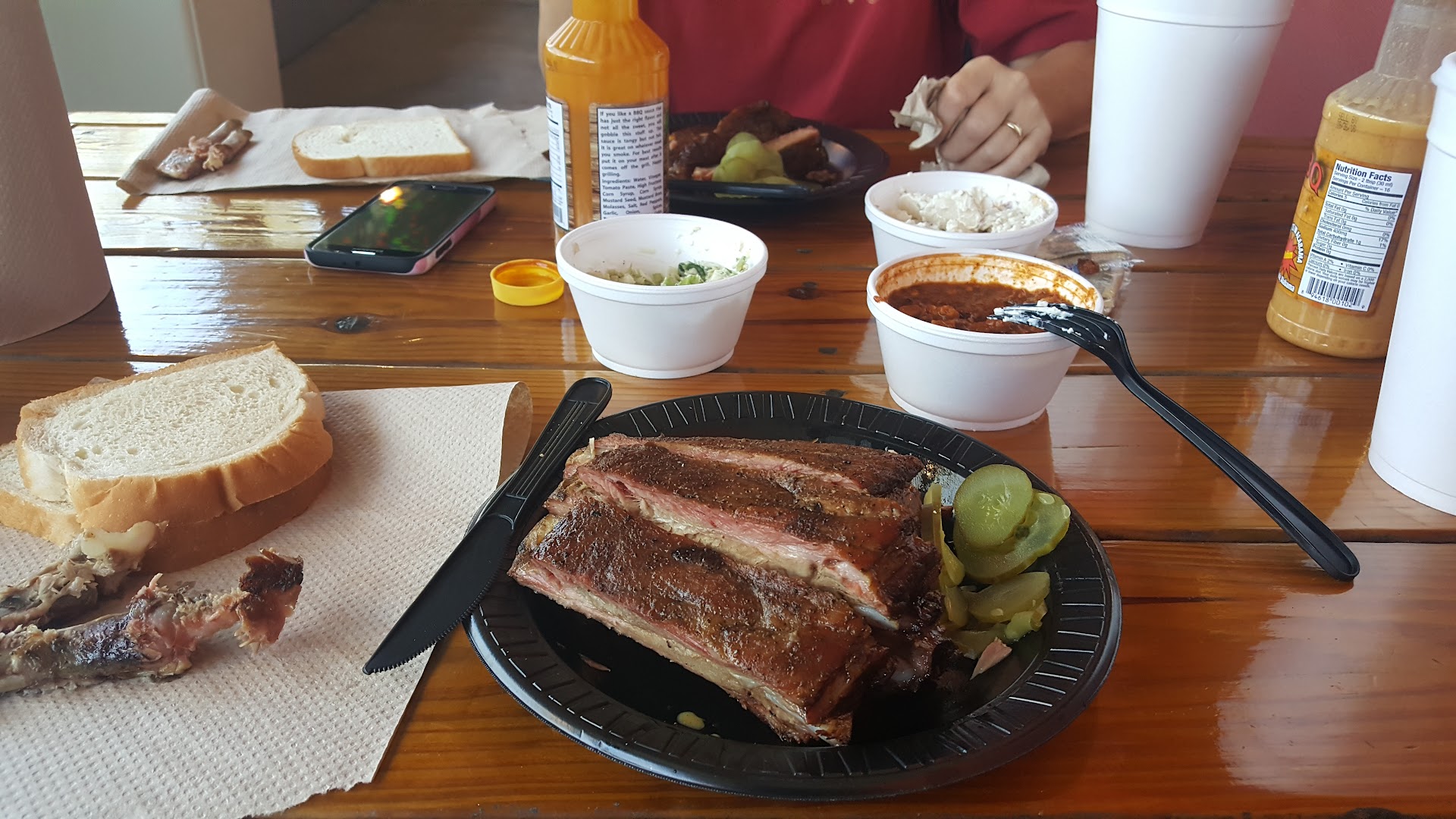Wife had the rib plate with baked beans and brunswick stew, she actually couldn't finish her plate, had to get a to-go box. The ribs had lots of meat on them, she was so happy. Same baked beans I had and she said the Brunswick stew was great.