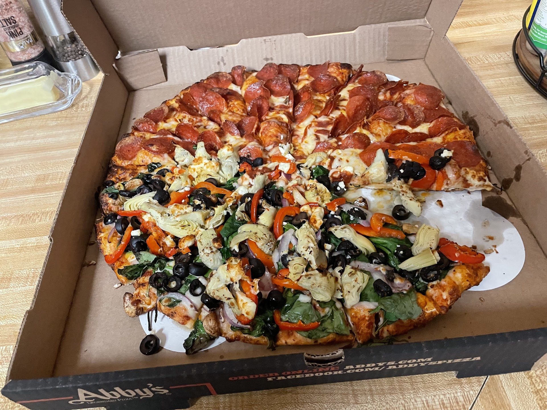 If you enjoy this Abby's location, stay with delivery to avoid having your enjoyment diminished. When we walked in, first thing we noticed was the salad bar looked like a tornado went through it. Salad and toppings all over the bar and floor, barely anything in the bowls. Over half the tables were in bad need of being bussed. I know it was Sunday game day, but seriously? There were still games on but the place was quiet, so no reason to have someone working on it. Of course, it COULDN'T have been either of the girls on the back line. They were "too busy" to even look up and acknowledge customers who were ready to order and get drinks. Fast forward a little bit... So, the first part of our order comes out... bread twists. With the bottoms burnt to a crisp! Do we not do a quality check anymore? I mean, they go from the cooking pan to paper-lined plate, so surely someone noticed. Was told "that's normal" while we were up for our spuds. Now for the spuds...the spuds themselves were good, but let's talk about the stupid Eugene ordinance (written by a 12 year old kid) about straws, flatware, and sauces. Ok, Abby's, first, your straw despenser was right on the counter, so using that argument was lame. Second, you gave us a BUCKET of marinara for 6 burnt bread twists, but 2 mini-packs of ketchup for an order of spuds??? For THREE PEOPLE??? REALLY??? Ok, now even if I get past that, the pizza itself... Ordered the advertised giant half and half (Hawaiian and pepperoni), original crust, light sauce. Were asked if we wanted plates when we picked up the pizza. My daughter said "Three, please." She was given two, by one of the girls from the back line (see earlier) with a haughty sigh like giving a family of 3 two plates was an over extension of her abilities. Got scorched crust, and the sauce was heavy and over powering, but at this point I was frustrated enough, we just dealt with it and left. So, the odds of me and my family ever returning to this location or getting delivery from them (since they're the closest to home) is slim to none. If I eat Abby's again, it'll be at a different store. Very disappointing.