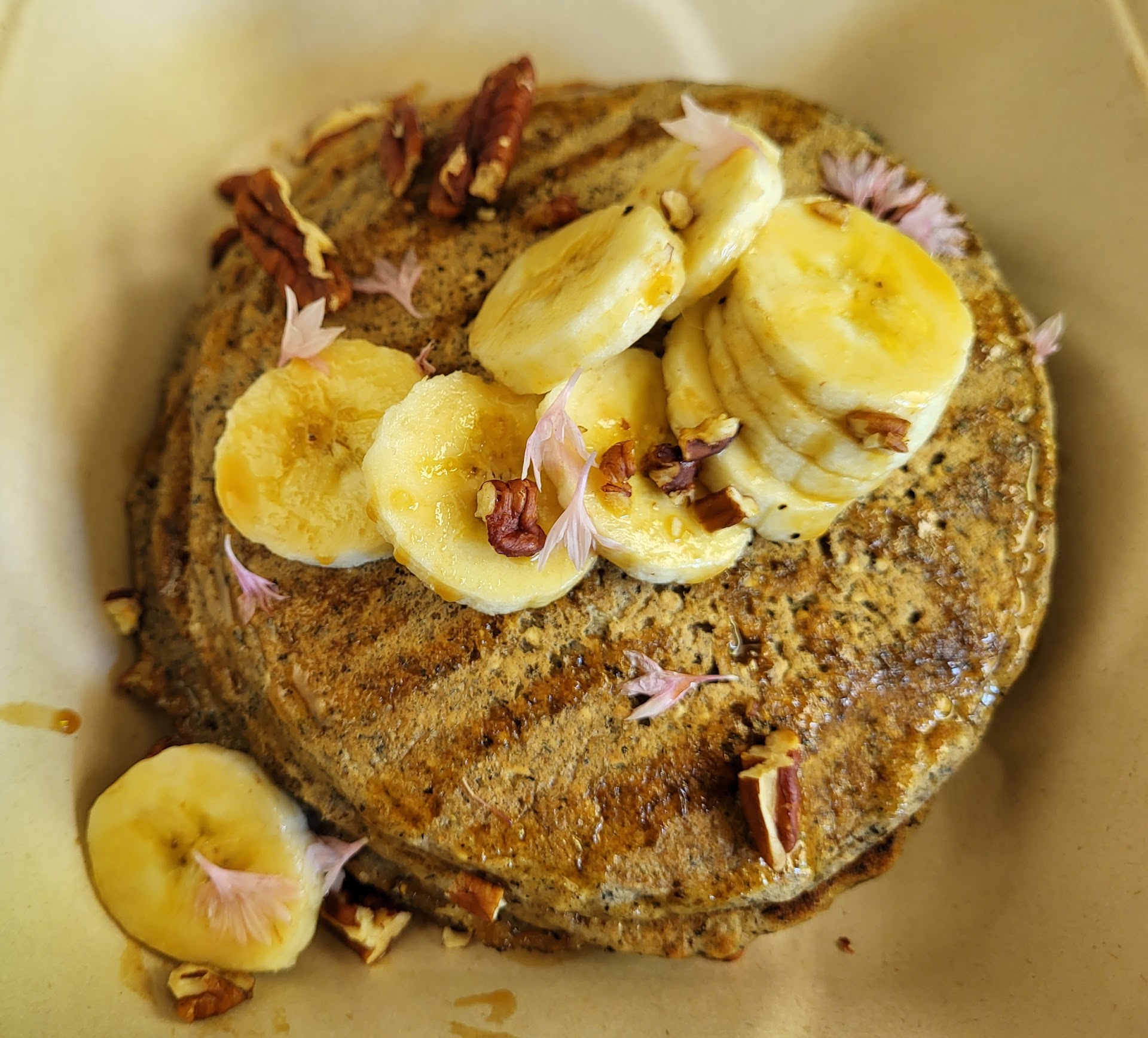I appreciated that even though it was to-go, they made it beautiful and included edible flowers on the pancakes. I ordered to-go at the restaurant around 12:30pm, and it took 30 minutes to be ready, so ordering ahead would be a good idea on Sundays...