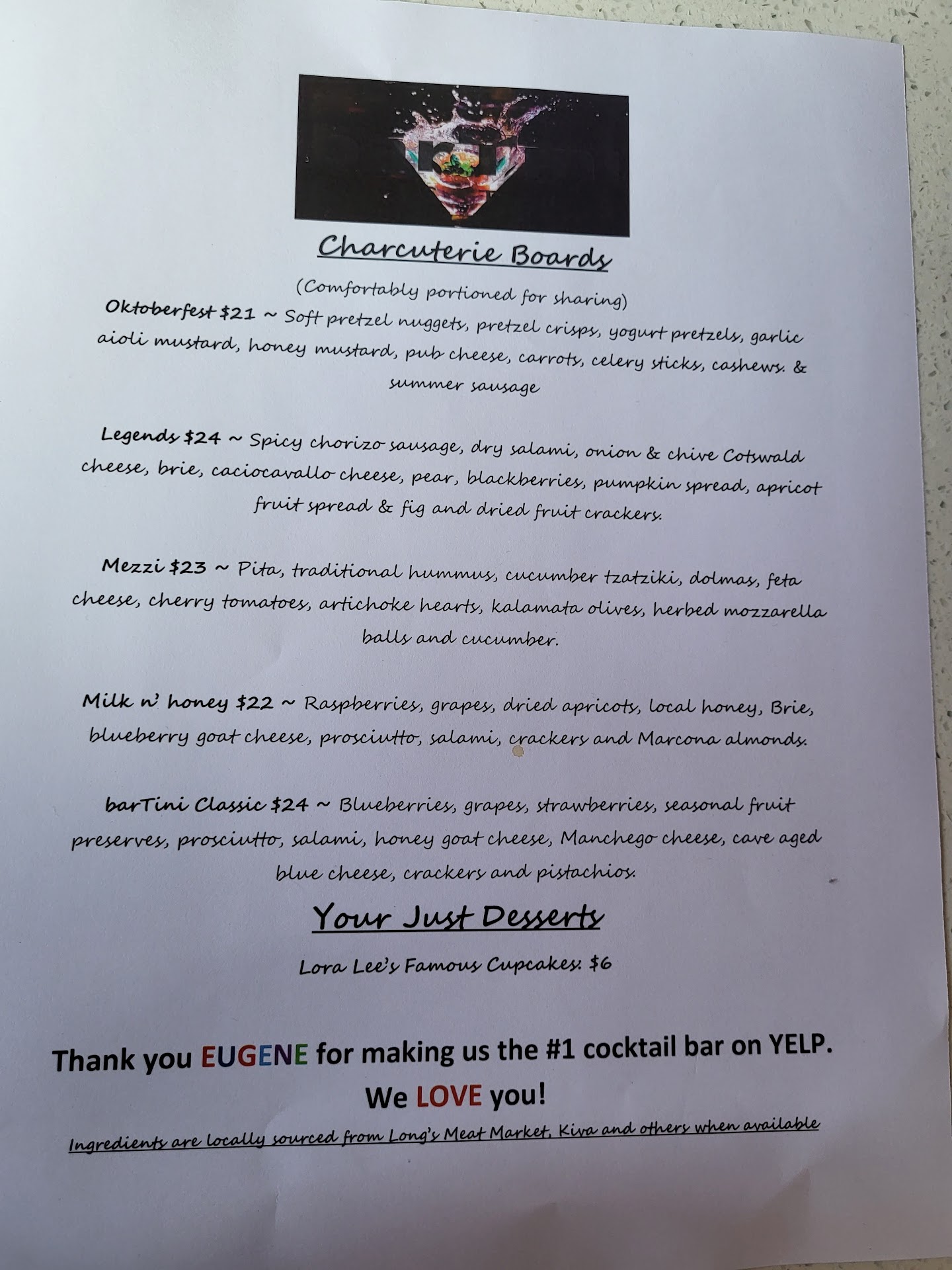 Ā Ā Ā Read moreI canāt even begin to express how much I absolutely LOVE this bar. Thereās nothing better than going to a public place like this and feeling like youāve been there a million times. Alison is my favorite bartender and I wish that I had service like hers at every other bar in eugene but unfortunately thatās not the case. The staff in general is so friendly and welcoming, the food tastes good, is fun, and is delivered with a smile and in a timely manner every time! Letās be honest though, you go a cocktail bar for the cocktails, and Bartini DOES NOT MISS. So many fun and creative twists on classic drinks, and different options for all wants and needs. Iāve been in with a few friends who donāt drink alcohol and Bartiniās Mocktails were so good that it made them feel just as welcomed. If you canāt tell by how long my review is, let me just say one more time⦠I...