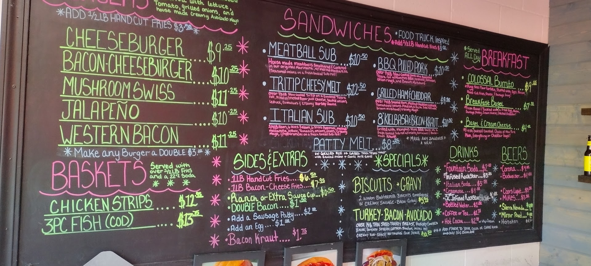 I was wrong. There was a full menu done colorfully in chalk, all sorts of Hollywood memorabilia on the walls, and only a small entrance to a couple lottery machines, nothing crazy.