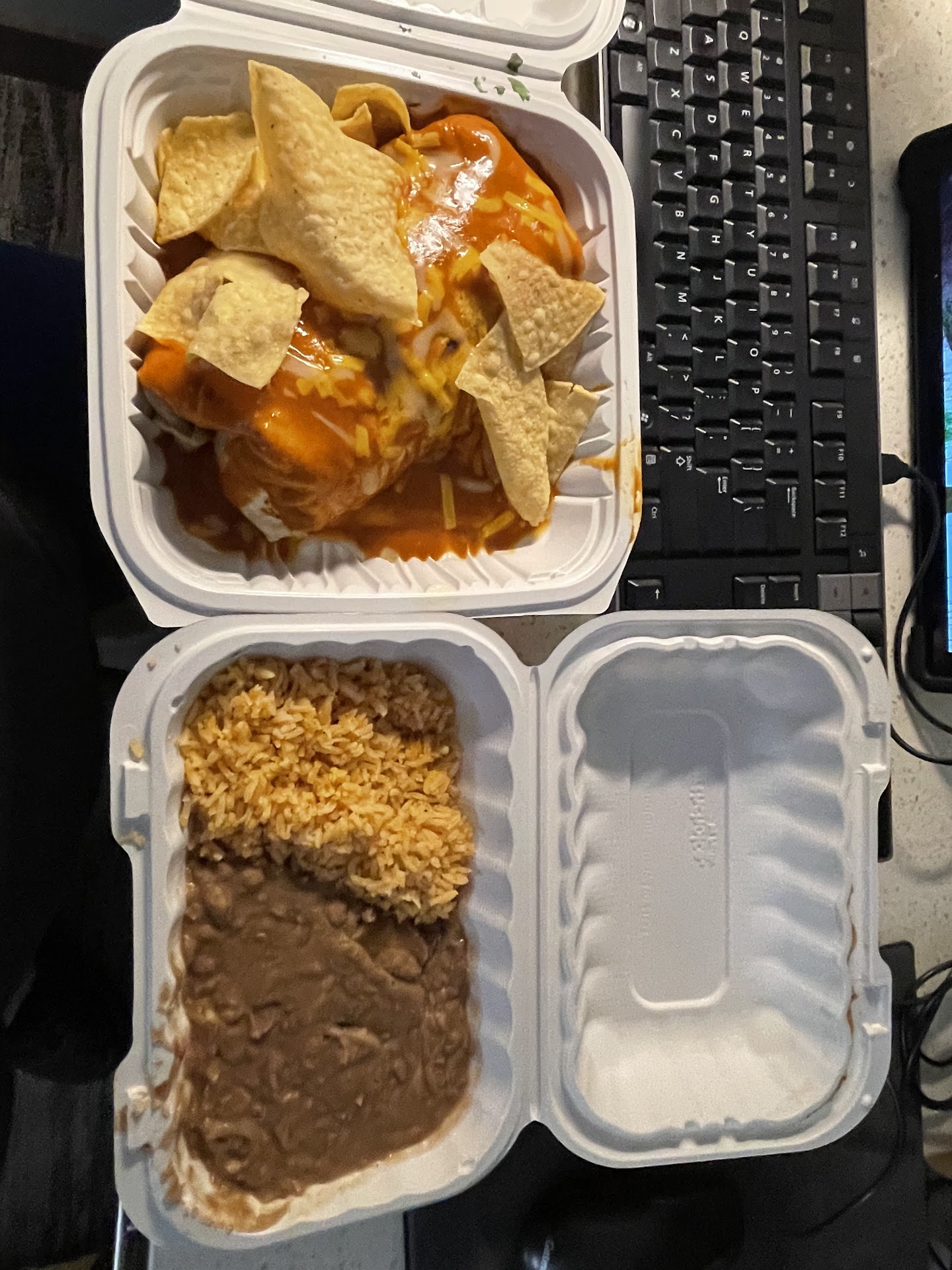 Flavor was⊠meh⊠itâs there, just light. Could have used more chilli powder and cumin, but thatâs my preference. The rice and beans were the same story. Thankfully I asked for some salsa, that helped.