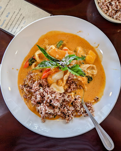 Almost 5 stars. Just don't try to tell me there is better Thai food in town! Ok, maybe the stand by Hifi has a punkin curry that rivals, but this place has gone from being good to excellent in the last 3 years. I suggest the Pad Thai with tofu and chicken mix or the Salmon Panang Curry. I'm used to being dissatisfied with heat levels when I order Thai and places assume I don't mean spicy when I do. Watch out honestly they are true to their word and Thai Hot means it is hot. I get just the regular hot. It's plenty hot! Once in awhile I get the Thai hot but it's just soooooo hot flavors aren't as accessible. Let's talk about the Pad Thai a minute. Fresh noodles and perfect umami. I pay extra for the protein mix to get a little more protein. Then add the peanut sauce which is the best in town (Mali on Valley River close second). The Salmon Curry is capital G generous with salmon and the broth is divine. Don't confuse it with the seafood curry which is good but not what I'm talking about. They have a mimosa cocktail with popping Boba that is soooooo good. I wish they could package one up for take out but alas we'll probably have to wait until the pandemic shifts to herd immunity, etc. Why 4 stars? Why not 5? Very very occasionally the black Boba in the bubble tea is not fresh, and getting take out means double checking because small items like a sauce on the side or napkins are forgotten 1 out of 5 times. Not bad ratio but always do check. Its likely because they are so busy because it's so good. Oh and forget about calling and getting through on a phone. I've gotten an answer maybe once out of many attempts. This isn't just one of my favorite restaurants here. It is the best Thai around Eugene and just an all around great place with...