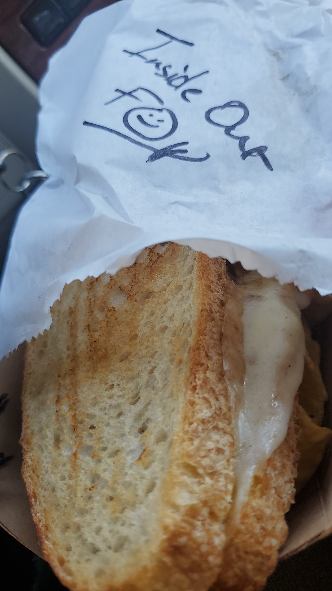 Ā Ā Ā Read moreIt's difficult to describe how much I truly adore Dove and James. Especially since I don't really "know them" know them. Cheese Bliss has been my Go To for a while now (after decades of searching for the perfect grilled sammie). But when I was at my lowest, having just lost my dad (he died on Christmas), they brought me joy on a very sad afternoon. Here's a picture of how my food arrived. Our family says that the reason everything from their truck tastes so good is because it's made with love. The hours are perfect, and I swear, I'd pay twice the price. Never...