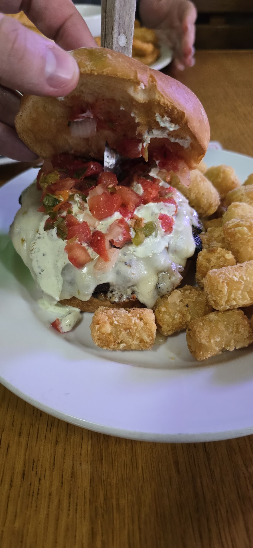 Read moreThis experience was a cluster of bad juju and not great atmosphere (music and flies). We ordered the cauliflower hot wings for an appetizer. Common sense says the dark orange dipping sauce on the plate was probably hot, but for some reason I thought it was some kind of roasted pepper hummus so me and my carrot stick were all in! Turns out it was the hot wing sauce. And it was HOT!! This mishap led to a coughing attack. And we all know how well that's received in public these days. During this coughing spell the music being piped thru the speakers had such a loud bass it felt like my heart was skipping a beat, which only exasperated the cough. Now a warning as to how hot this sauce was from the waitress could have nixed this entire experience. But also common sense. What I ordered was the baby bleu burger with no guac, extra bleu cheese, double bacon and sautéed mushrooms. What I got was sautéed onions. Otherwise the burger would have been perfect. And while picking the onions off of my burger a fly landed on it. I swatted at it, it flew away and landed on my shirt. I brushed it away and in the process left a grease and bleu cheese stain on my top. Two flies continued to torment us throughout the rest of our meal.