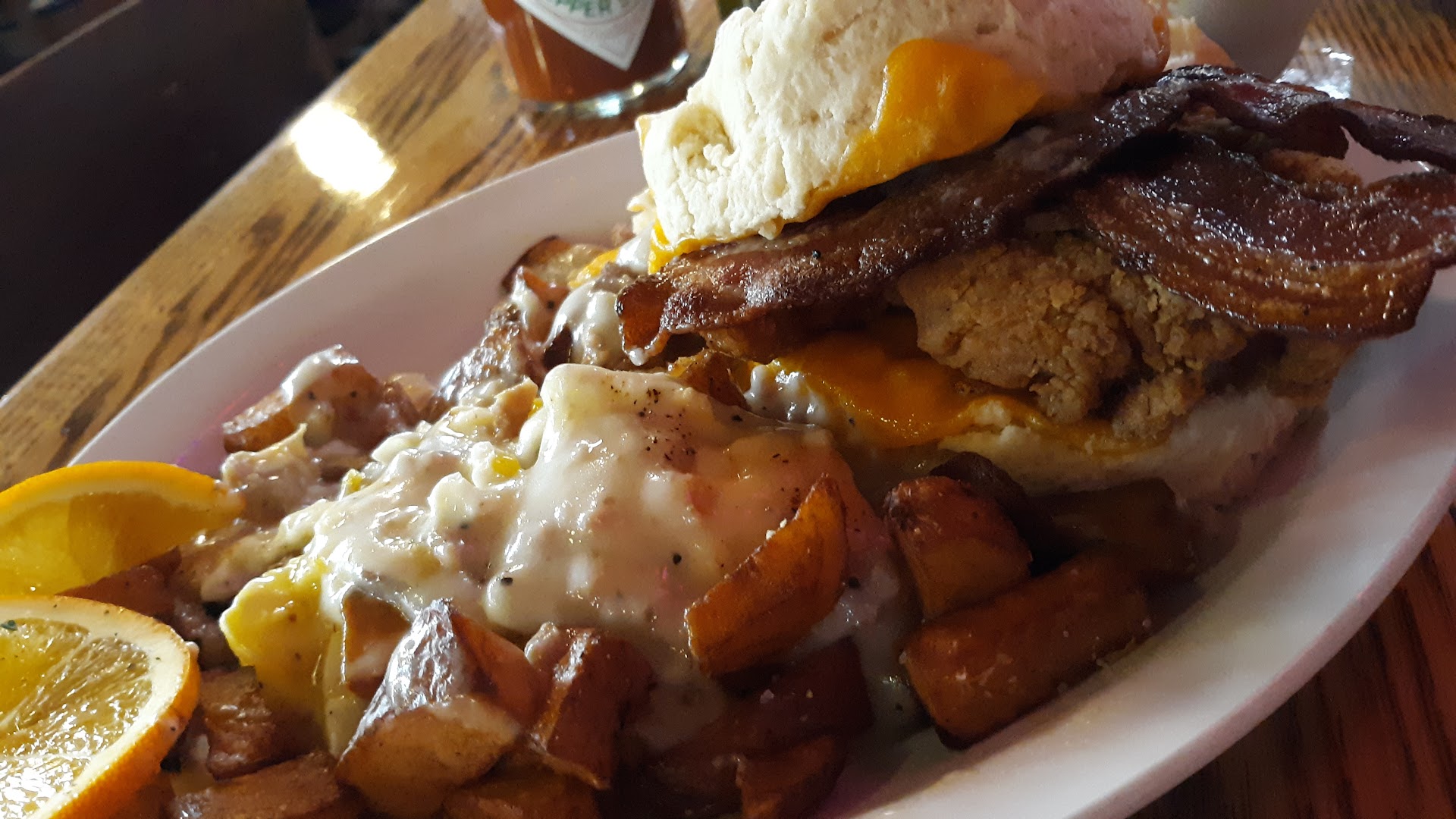 Read moreThis experience was a cluster of bad juju and not great atmosphere (music and flies). We ordered the cauliflower hot wings for an appetizer. Common sense says the dark orange dipping sauce on the plate was probably hot, but for some reason I thought it was some kind of roasted pepper hummus so me and my carrot stick were all in! Turns out it was the hot wing sauce. And it was HOT!! This mishap led to a coughing attack. And we all know how well that's received in public these days. During this coughing spell the music being piped thru the speakers had such a loud bass it felt like my heart was skipping a beat, which only exasperated the cough. Now a warning as to how hot this sauce was from the waitress could have nixed this entire experience. But also common sense. What I ordered was the baby bleu burger with no guac, extra bleu cheese, double bacon and sautéed mushrooms. What I got was sautéed onions. Otherwise the burger would have been perfect. And while picking the onions off of my burger a fly landed on it. I swatted at it, it flew away and landed on my shirt. I brushed it away and in the process left a grease and bleu cheese stain on my top. Two flies continued to torment us throughout the rest of our meal.