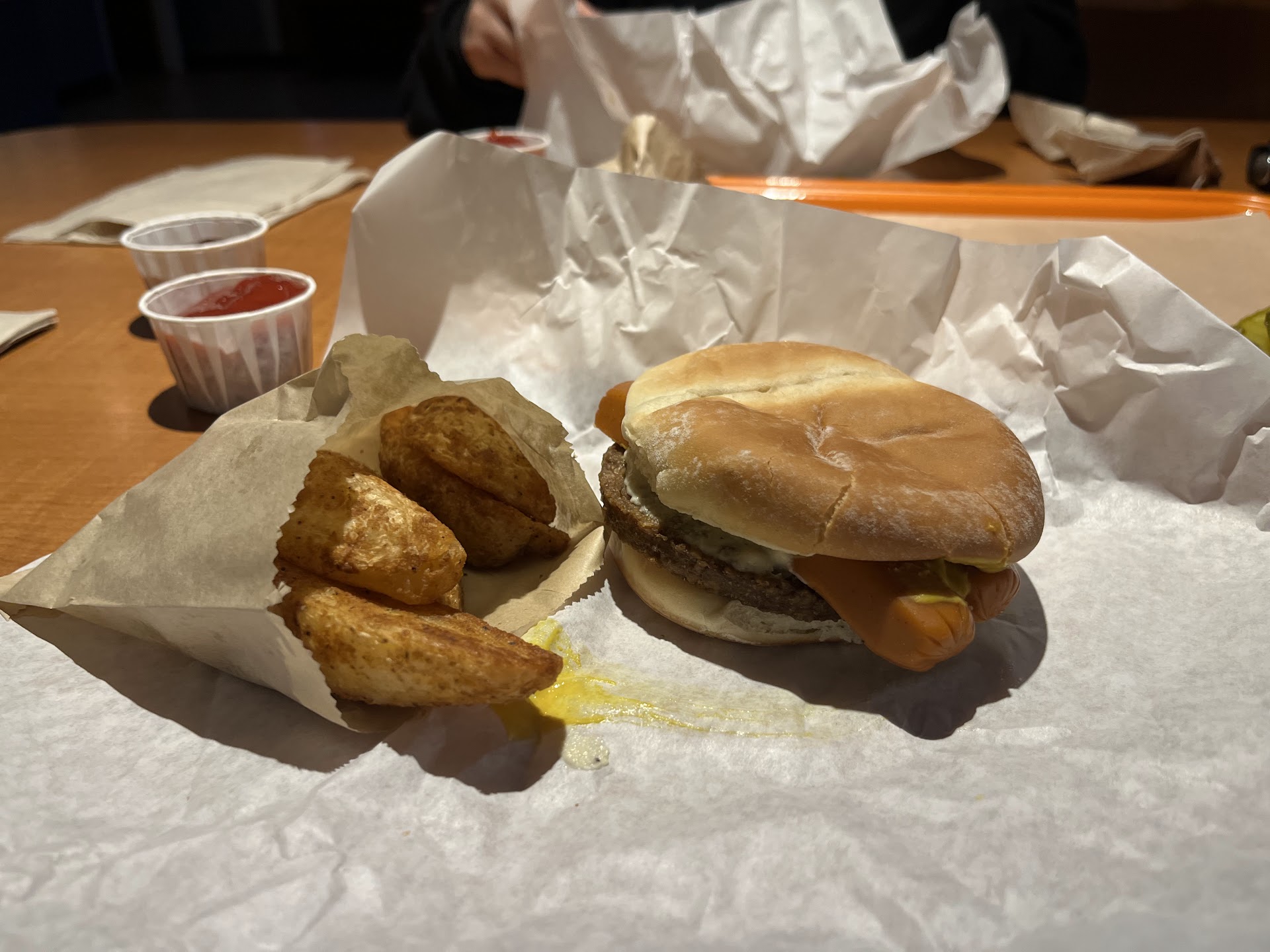 Read moreDelicious and affordable vegetarian food in a fun and friendly diner set-up! This is my favorite new restaurant since Tiger Mama. All the dishes are inspired by various fast food items of the past. And I will say, service was quite fast especially considering this is real food that's not just being reheated or microwaved. We ordered the combo burrito, lentil bowl, potato wedges and pier burger. The whole order was out pretty quick, and everything was hot. Combo burrito is crazy filling for only $5 (as of 2024) and the soy chorizo is delicious. I added hot honey and sauce for a little more flavor. Potato wedges are pretty good, crispy skin and fluffy potato inside. The lentil bowl was my favorite item though. The fried tofu was delicious dipped in ketchup, the jasmine rice is fragrant, and the curry and lentils were really flavorful. As far as the atmosphere, it's kind of a retro diner from another dimension I guess? It's fun! There's pachinko machines, Mario arcade and a pinball machine. It's a fun little activity while you wait for your food. In summary: really delicious and filling fresh made vegetarian food (with gluten free and dairy free options). And actually affordable, more so than most of the other restaurants in Eugene. I highly recommend...