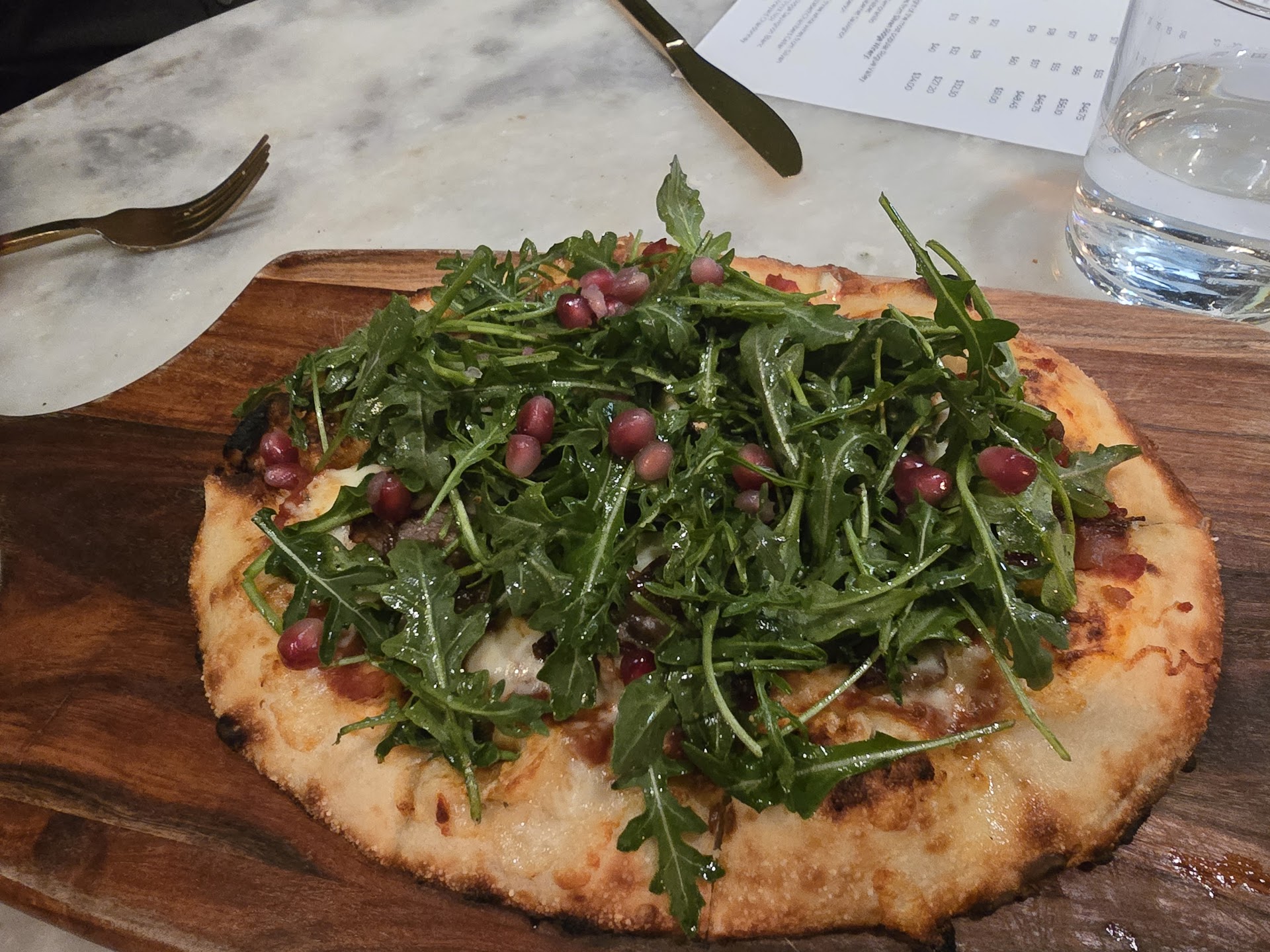 The food itself was another disappointment. My salmon was overcooked, dry, and fried, leaving a lot to be desired for a special occasion. To add insult to injury, there was only one Brussels sprout on my plate. For the price we were paying, this portion felt incredibly skimpy and unthoughtful. My partner’s steak flatbread was even worse – it was mostly a bed of arugula, and honestly, it looked more like a salad than anything close to a flatbread. The presentation was sloppy, and the flavors didn’t impress.