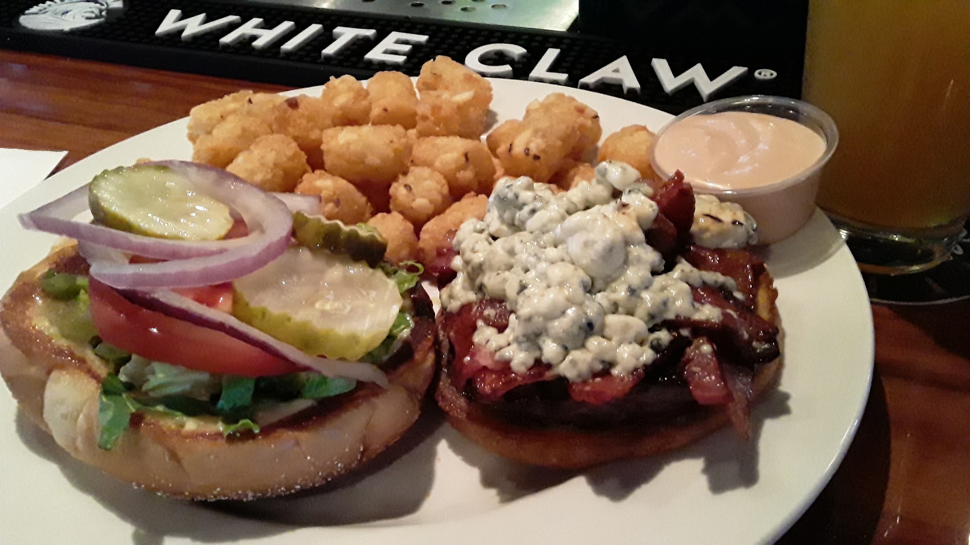 Mom good the French dip. It was tender, has great flavor and a good portion of meat. The au jus had a bit of an onion flavor which was yummy. The side salads with both that and the burger were fresh and a pretty good portion. The blue cheese dressing was good as well.