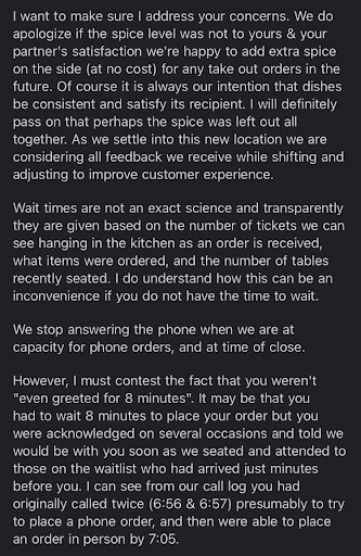 The first time ordering everything was perfect. The 2nd time, not a good experience in multiple ways. We ordered Thai papaya salad and the crispy rice salad. We ordered medium spicy. There wasn't even a single piece of pepper in either, not even a single flake or thai chile remnant; food was bland. Spice gives the papaya salad its compliment to the fish sauce and lime. Otherwise, it tastes a little nasty. We refrained from putting this in a review right away and filled out a feedback form online. The response from management was apologizing that the spice level was not to satisfaction, and "perhaps" they left it out altogether, but offered no compensation. Even the initial start of ordering process was shaky. After the minites of watching workers walk back and forth multiple times, they finally said, "I see you". We were told 15 minutes and it turned into 30, which we understand busy, but give us a window using the most amount of time. When the food was hanssd over they had already flipped the clossed sign. Under promise and over deliver instead of the opposite as we gladly could have ran an errand in the meantime. We did try to call several times to pre order over the phone, even as walking into the establishment.