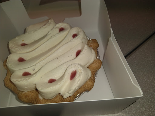 I work nearby and stopped by here for the first time today. The staff was very friendly and they had a great selection of sweets. I decided to try the strawberry cream pie. The gentleman that helped me said it was very creamy, and it is! It has a dense whipped cream top with a creamy custard layer with strawberry slices inside. I really liked the little bit of strawberry with lots of cream! The only downside is the crust is a bit thick and chewy. I prefer a flakier crust. I suppose it's that way because the pie is so dense, it helps hold it together. But it does not add to the deliciousness of the pie. I'll be back to try s pie with a graham cracker crust next time... Or a cinnamon roll (they looked amazing).