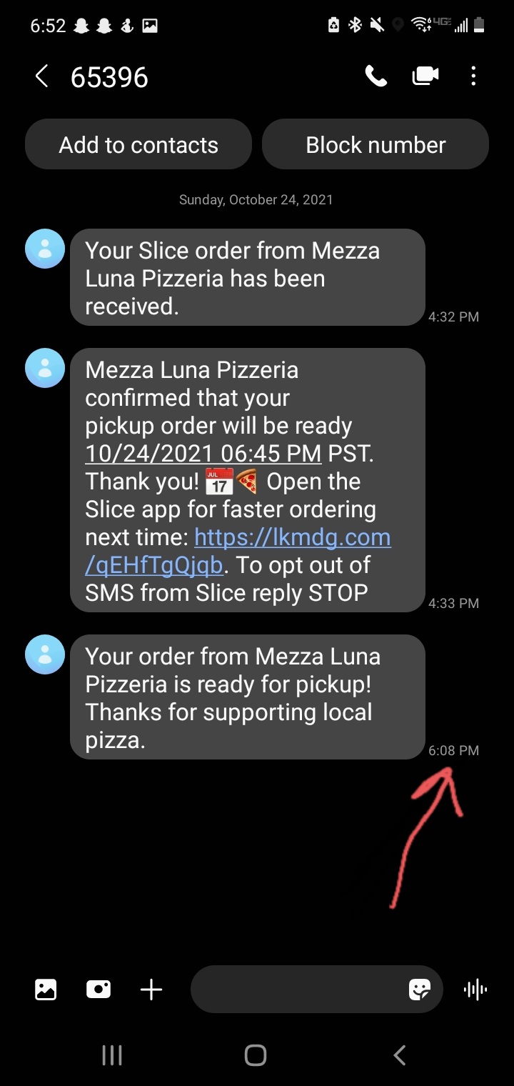 Read moreFor the first time tonight we decided to eat here at mezza luna for are anniversary! Are kids joined us as I wanted to have a fun night at a pizza place we had never eaten at before...after ordering 5 slices of pizza a med. Caesar salad garlic cheesy twists and drinks our total coming around $50...we will not be coming back the lady who brought are food was told thankyou multiple times not even a smile or a your welcome or really any words were given. If I had to guess it seemed as if she hated her job. We received are pizza it was burt. The salad wasn't bad. Then when we were finished with are pizza and salad we were so tired of waiting for the garlic and cheesy bread twists my husband was bringing are daughter in to use the restroom and was gonna tell them just don't worry about it if they haven't been made yet as we were ready to go. Well they came to the table when they were in the restroom and they were burnt horribly on the bottom...apparently I got a box packed it up and was gonna take it home because my son was tired and had been there long enough. So when we got home it was bedtime for the kids and of coarse any excusses to get out of going to bed so I pulled out the garlic cheesy bread and my kids emeadietly spit it out in the garbage...needless to say I feel $50 was completely wasted and after the service and food being sucky we will not be returning!!! Calling...