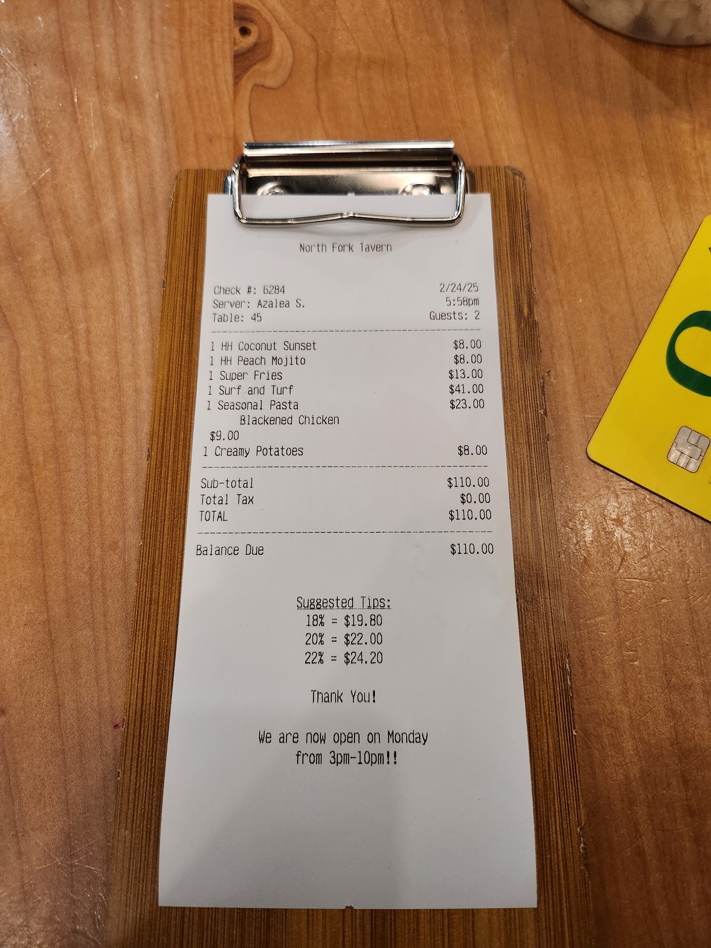 Pricing - I believe the fish and chips were around $15, and the seasonal fish was closer to $20, just for reference. Well worth the cost for the dining experience we had. Will most definitely be returning to this establishment...
