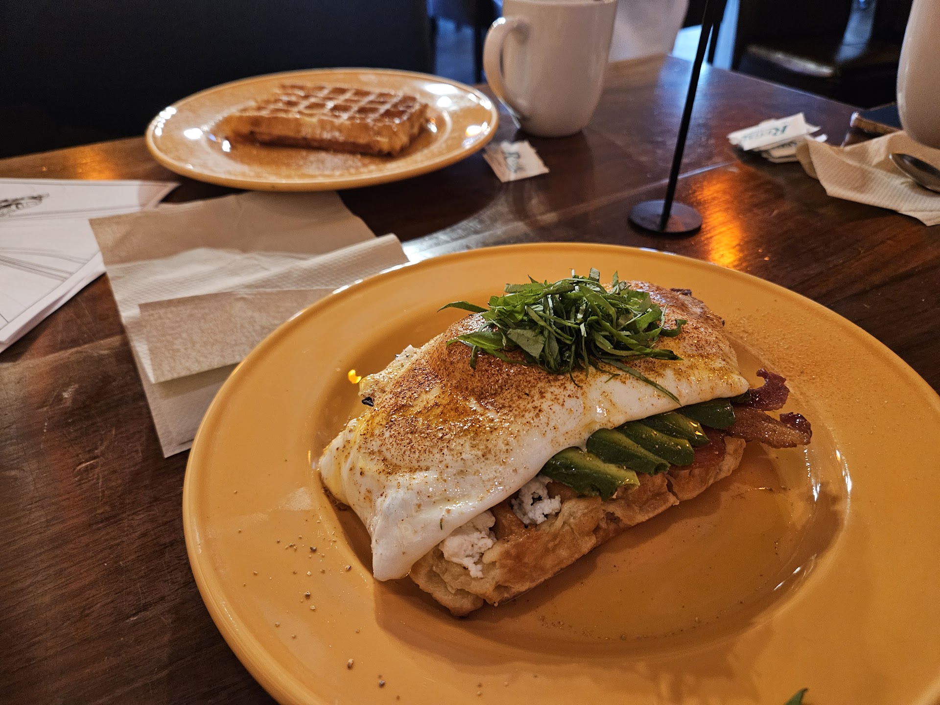 The food was a horrible disappointment. I got "THE GOAT IN HEADLIGHTS - Liège Waffle topped with chèvre (goat cheese), organic avocado, fresh organic basil, two sunny side up organic eggs"