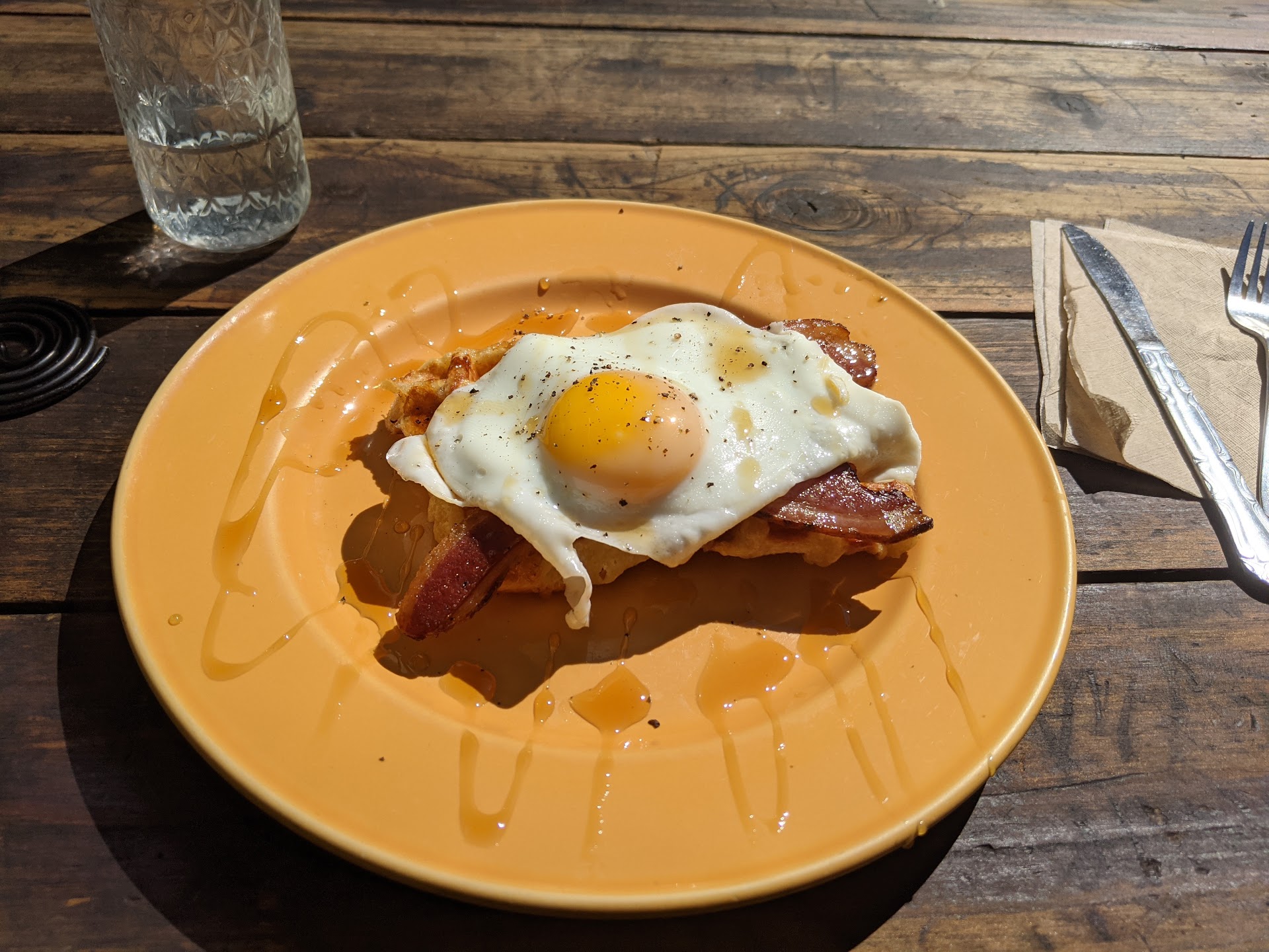 We also ordered "THE SELF FULFILLING PROPHECY - Liège Waffle topped with one sunny side up organic farm fresh egg (oozing yolk*), nitrate/nitrite-free bacon, real Vermont maple syrup" with an extra egg.