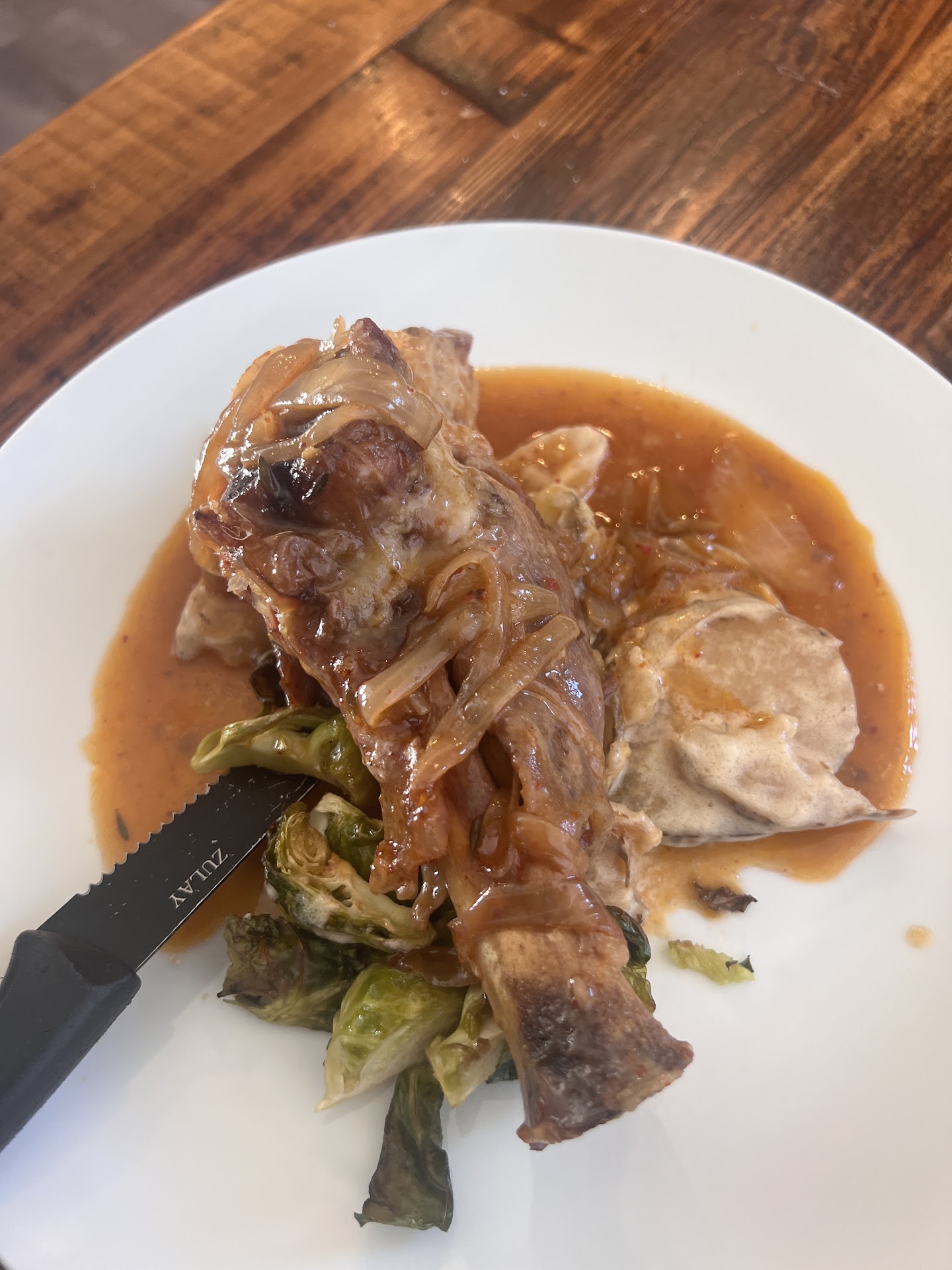 I ordered the potato and onion soup with homemade sourdough bread, lamb chop with Brussels sprouts and potatoes and an apple hazelnut bunt cake.