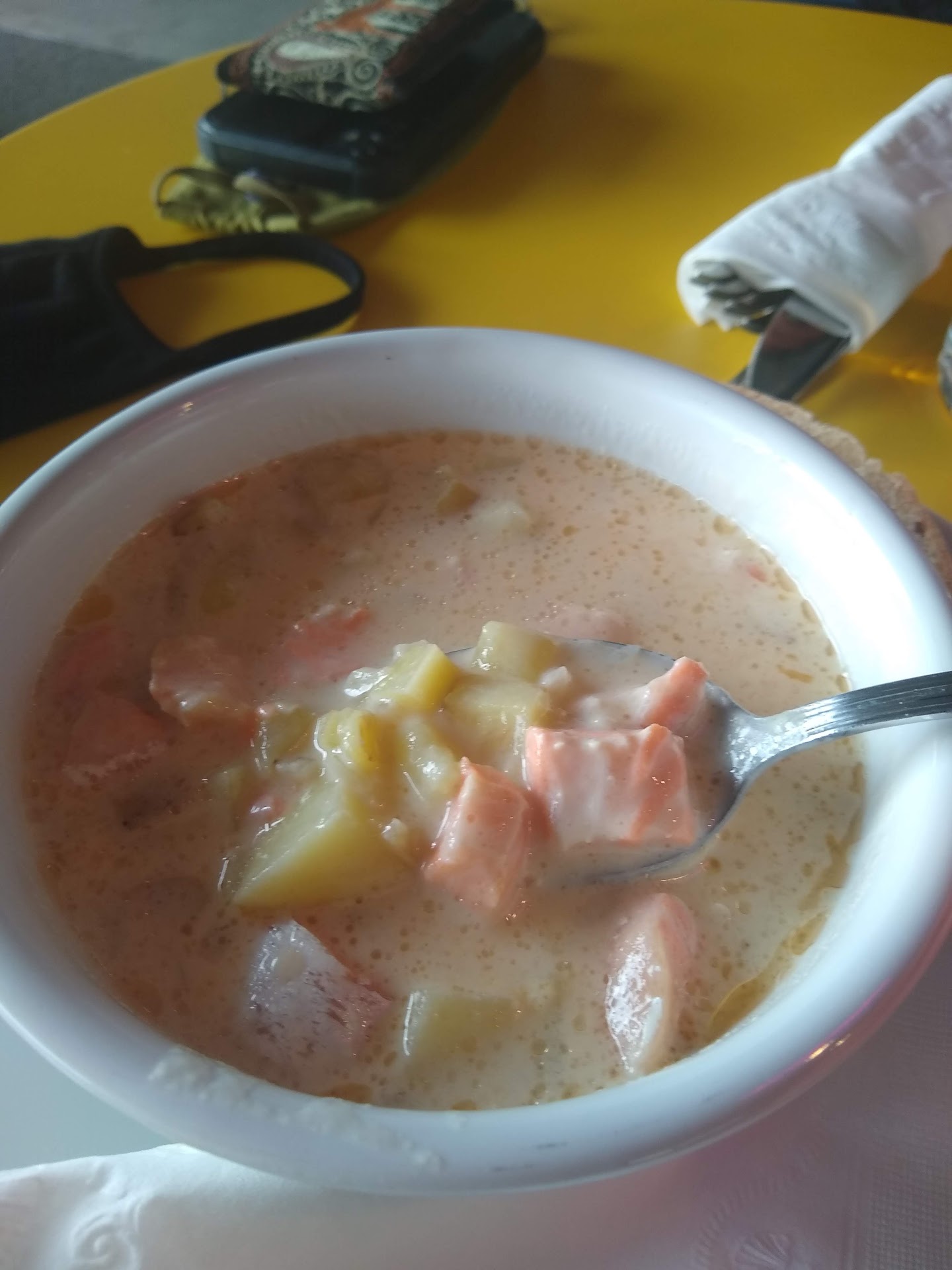 First off the staff was amazing, I truly enjoyed my conversation with them and enjoyed they seemed genuinely interested in learning about me also. The potato and onion soup was amazing, I truly appreciate the starchy texture with the perfect balance of onion. The sourdough was good i loved the depth and bounce of the bread but would have preferred it a little warm.