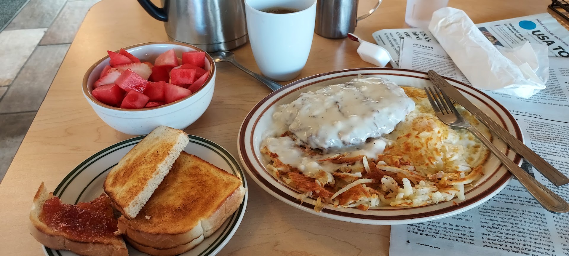 Read moreMaybe it was on off day. We ate here based on reviews, and were disappointed. It definitely has potential to be awesome though. All the staff was very friendly And welcoming. Lovely crew. The organization for seating waiting customers is a bit disorganized. We only saw our waiter 3 times. To take our drink order, bring our drinks and take food order and then to drop off food. No check in for refills or additional items that might be needed. Not even to bring our check. This is why we scored down on service. But they get 5 stars for being very friendly when interacting with customers. We ordered the biscuits and gravy and a pancake. All the food was close to being cold, like it had been sitting for awhile. The pancake was tough, like it was over mixed. The flavor of food was delicious, just not hot off the stove, at all. Coffee was fresh and hot and that was a plus for us. Noticed that having to order sides with a lot of meals, which drive up the overall cost, because meals didn’t include hash browns, toast, and items we are used to seeing be included in breakfast meals. It was about $40 plus tip for the two of us. We would be willing to give it another try next time we are in town because we did see and taste the potential and think it maybe have been an...