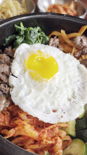 Initially what pulled me in was the photos of the Tofu Stew, but then I saw the Bi Bim Bap for $14.99 and decided that was the way to go. It was an excellent choice. It arrived steaming and sizzling in the hot pot. Typically Korean restaurants will charge extra for it to arrive in the hot pot, but this restaurant has one price -- and it's the best price in town for $14.99. appreciatively the proteins, beef chicken or tofu came as part of the price )instead of as the usual additional extra $2 that is too often the case.) The BBB came with three side dishes a.k.a. banchan that included marinated Julienne Daikon (vinegar based and slightly sweet) Mung Bean Sprouts (slightly blanched & seasoned) and kimchi. The BBB came with the sweet red chile sauce (not that spicy at all) to season to taste. The only thing missing was the sesame oil which was quickly provided upon request.