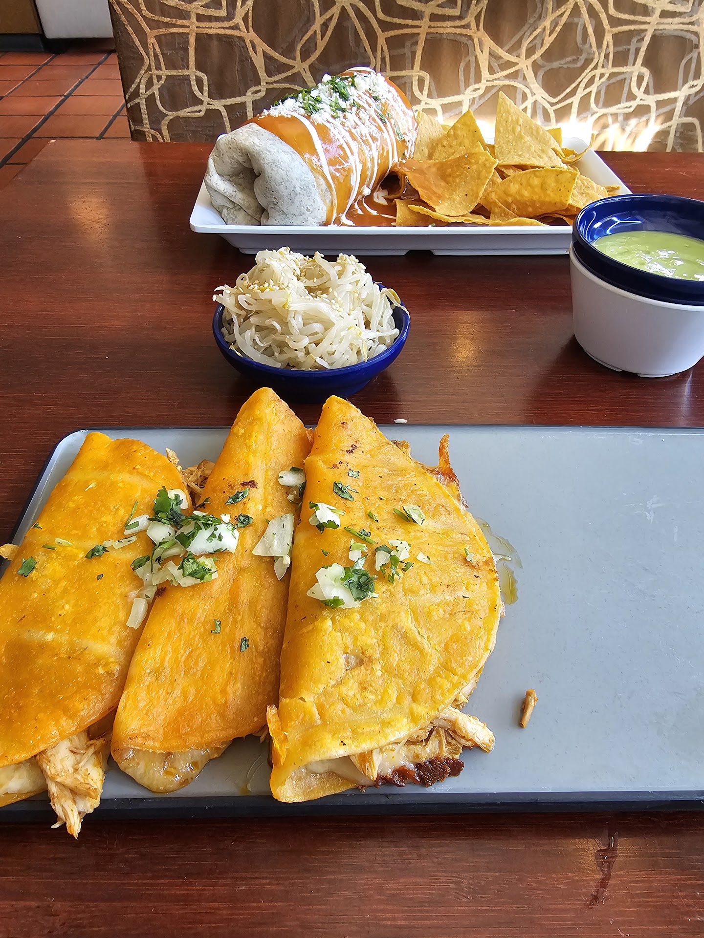 Read moreI went here with my brother and was excited to try it. We ordered the birria egg rolls and a sticky chicken burrito. We found a table and within 3 minutes we were being served our egg rolls and the server apologized for having it in a to go container as we had stated we we're dining in. I said no worries and that I was astonished it was ready so fast. I opened the container and was surprised to see 3 birria tacos not egg rolls. I glanced over at my brother and his face confirmed that I did indeed order the egg rolls. I closed the container and left the aju at the table as I headed up to the counter and waited a minute to catch the attention of the server and informed him of the mix up. He seemed confused but once he opened the container he then went over to the register, I assume to recheck the order and then apologized. About 2 minutes later he comes back to our table and without a word picks up the aju and rushes over to the counter to hand a pick-up customer the birria tacos and aju. We then got our order of egg rolls all three of which were still very cold in the middle. The sticky chicken burrito on the other hand was delicious. However given the over all experience I do not think I'll...