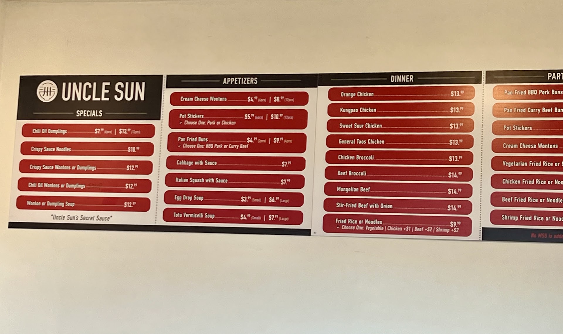 The only negative thing that I do wish would be fixed... is how their menu is written / advertised. Yes, different websites mentioned mostly the same items, but some had items that others didn't have. (Ex; grubhub mentioned steamed buns, but their website only mentioned the pan fried option) Also with the menu, I wish there was a little bit of an explanation on some items. Maybe a description of what type of flavor Uncle Sun's Secret Sauce is. I know it's a secret (and my mom did love it) but she was hesitant to order something with it without knowing anything about it. Another item that isn't described is the "Cabbage with Sauce," it doesn't mention what type of sauce is used.