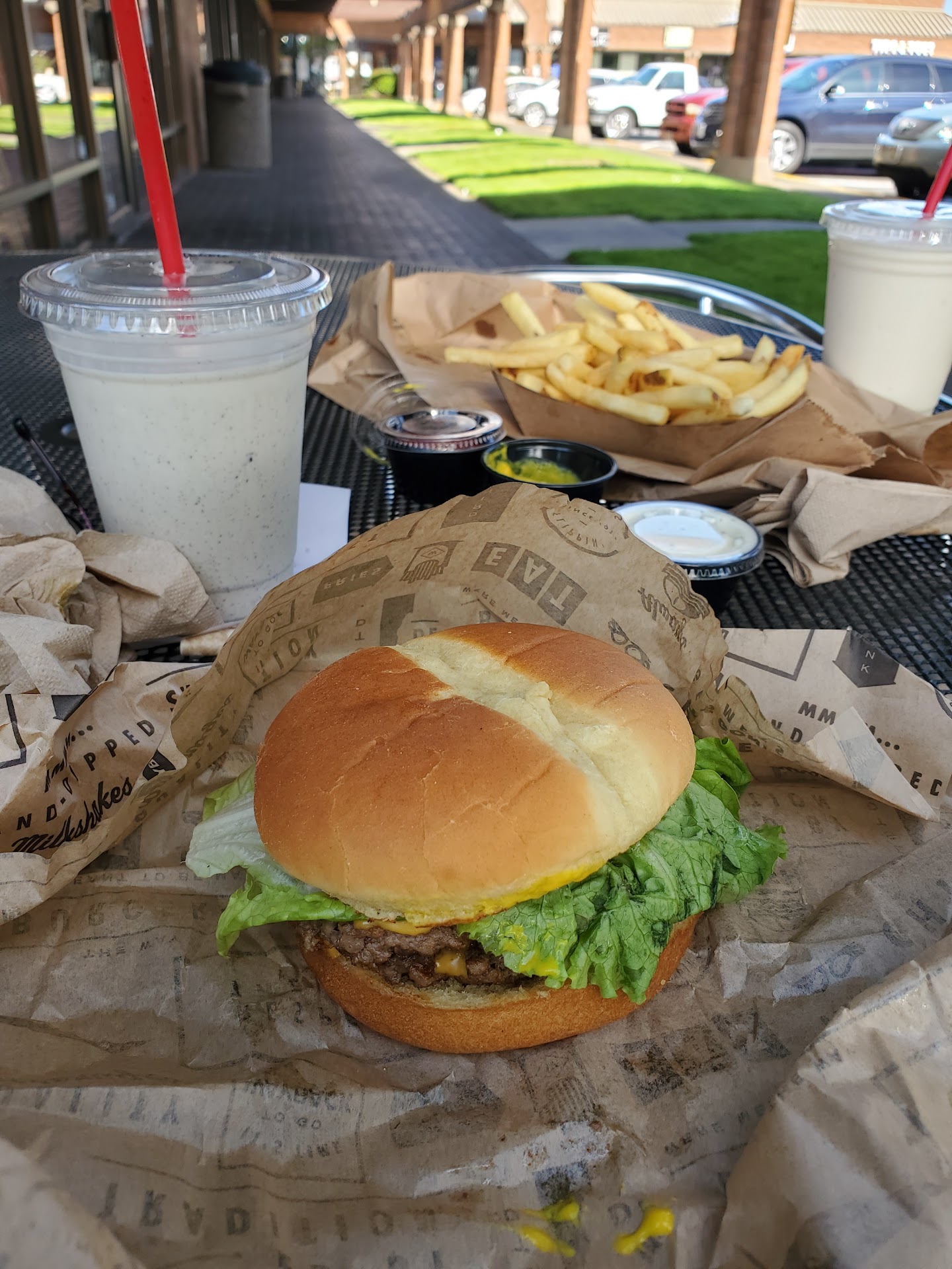 My burger was so soaked in mustard it soaked into the wrapper during the 9 minute trip from the restaurant to my house and when I pulled it out of the bag the burger wrapper was actually tearing into bits and leaking out into the bag. I figured okay, things happen, no big deal..... Except when I tried the burger it dropped mustard the entire way through, I like mustard, but this was heartburn inducing three to four tablespoons worth of mustard, one sad pickle and 5 little onion squares. If the burger did have any seasoning, it was impossible to tell, all I tasted was mustard and I gave up halfway through. The onion rings were weird, flat, greasy disks with no flavor to speak of and the shake tastes like a half cup of Hershey's syrup.... That over sweet, artificial chocolate flavor. That is just my order.