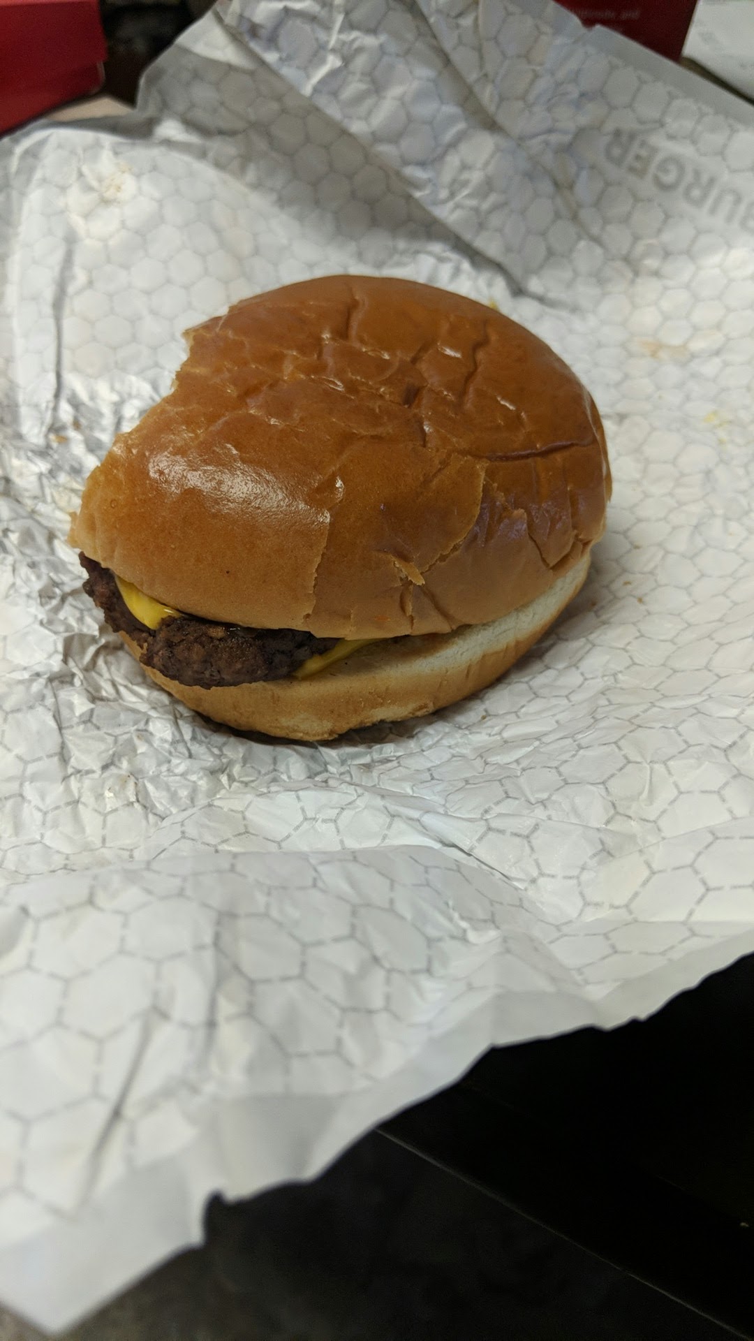 The food was disappointing. The formerly juicy and tasty Wendy's burgers were dry, tasteless, and served on a greasy bun. These \used\ to come with lettuce, tomato, onion, pickle, ketchup, mustard, mayo, and (optionally) relish. I had them hold the pickle, and they held just about everything else -- my dry burger had nothing but lettuce and a dab of mayo on it.