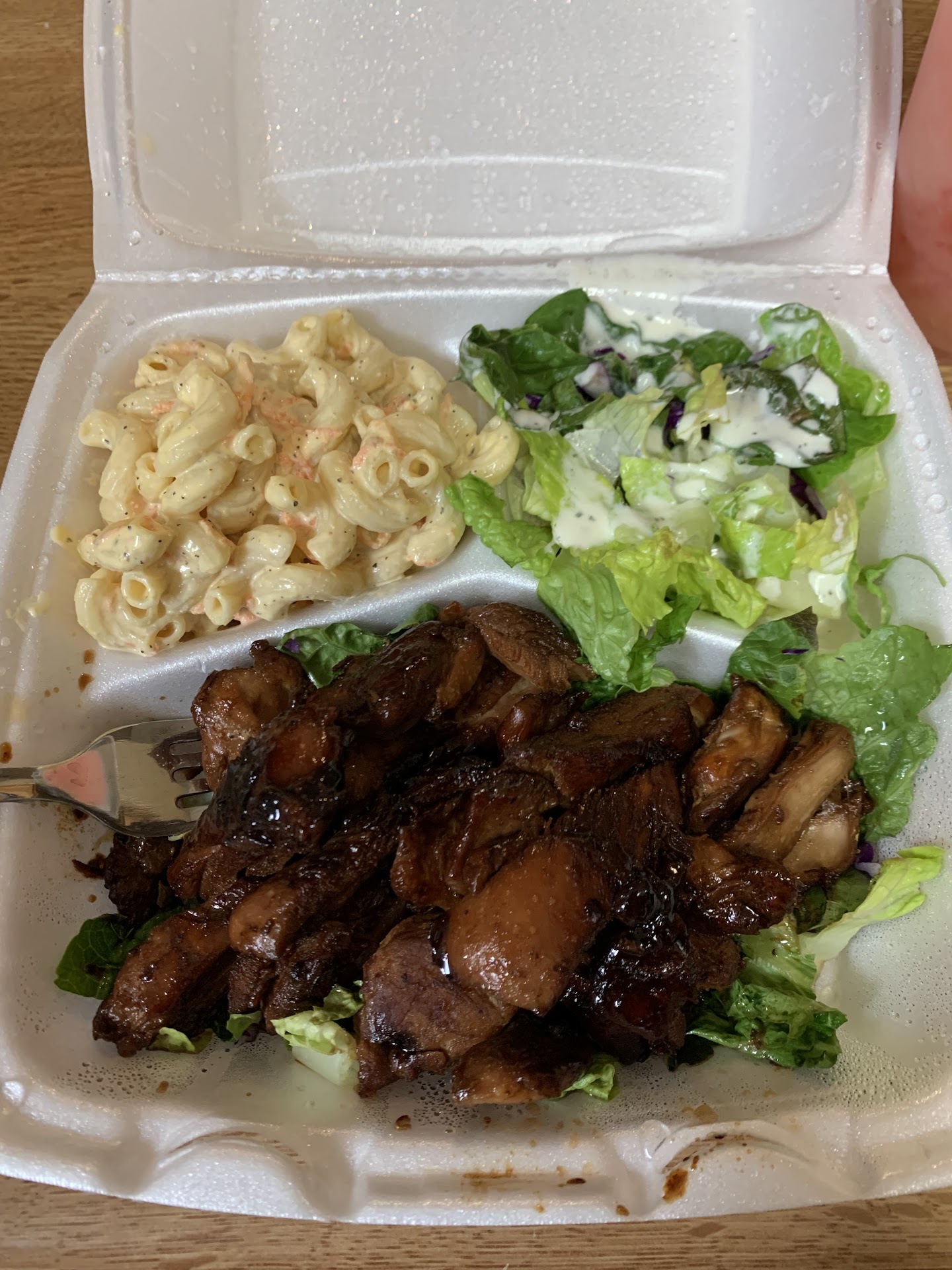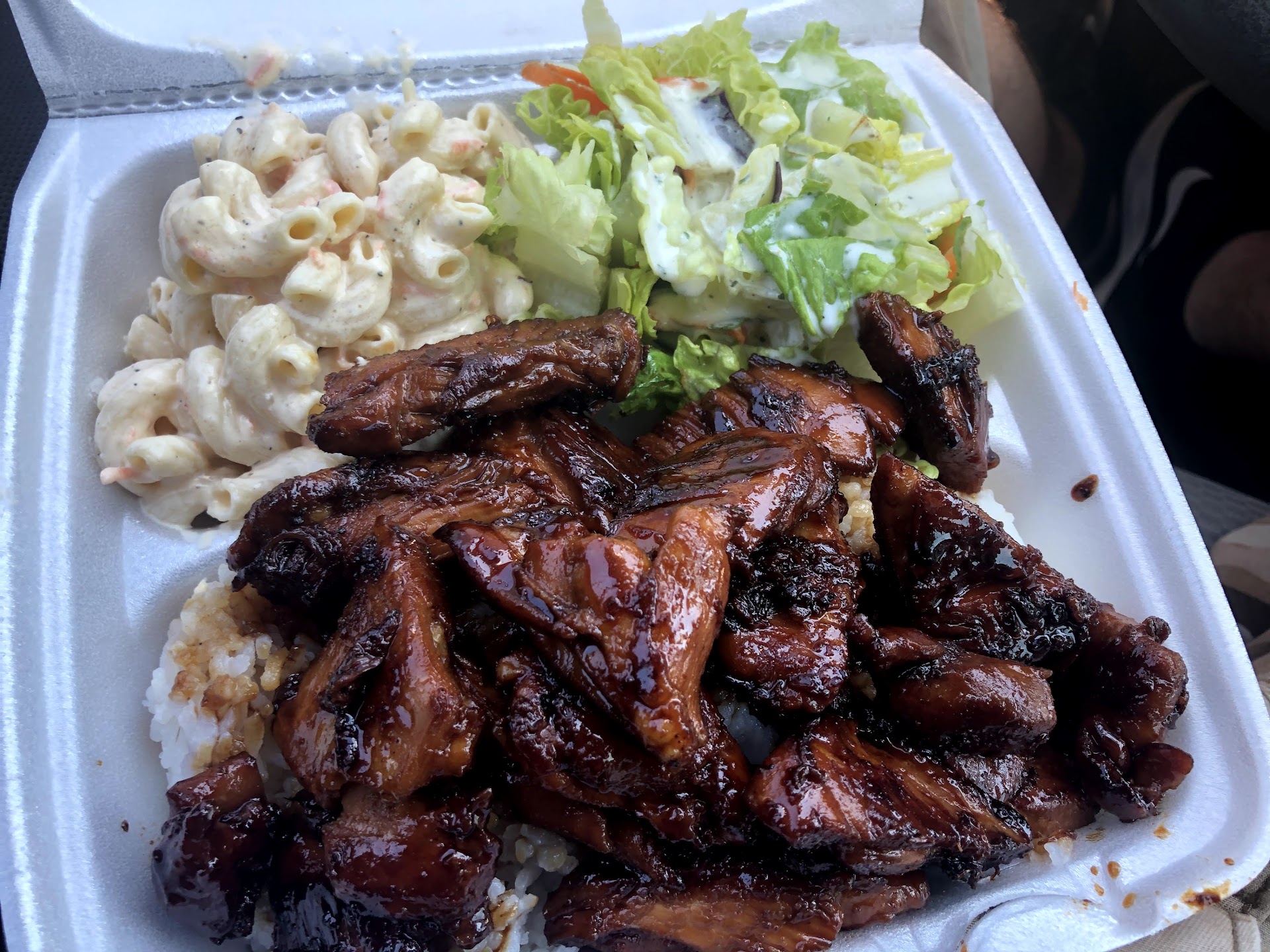 I order the laulau. Was excellent! Meat was juicy, flavourful, great portion size for 10.99. Serves over a bed of rice and two sides, a green iceberg salad and hawaiian favorite mac salad. Mac salad is a mayo base dressing on elbo Macaroni.