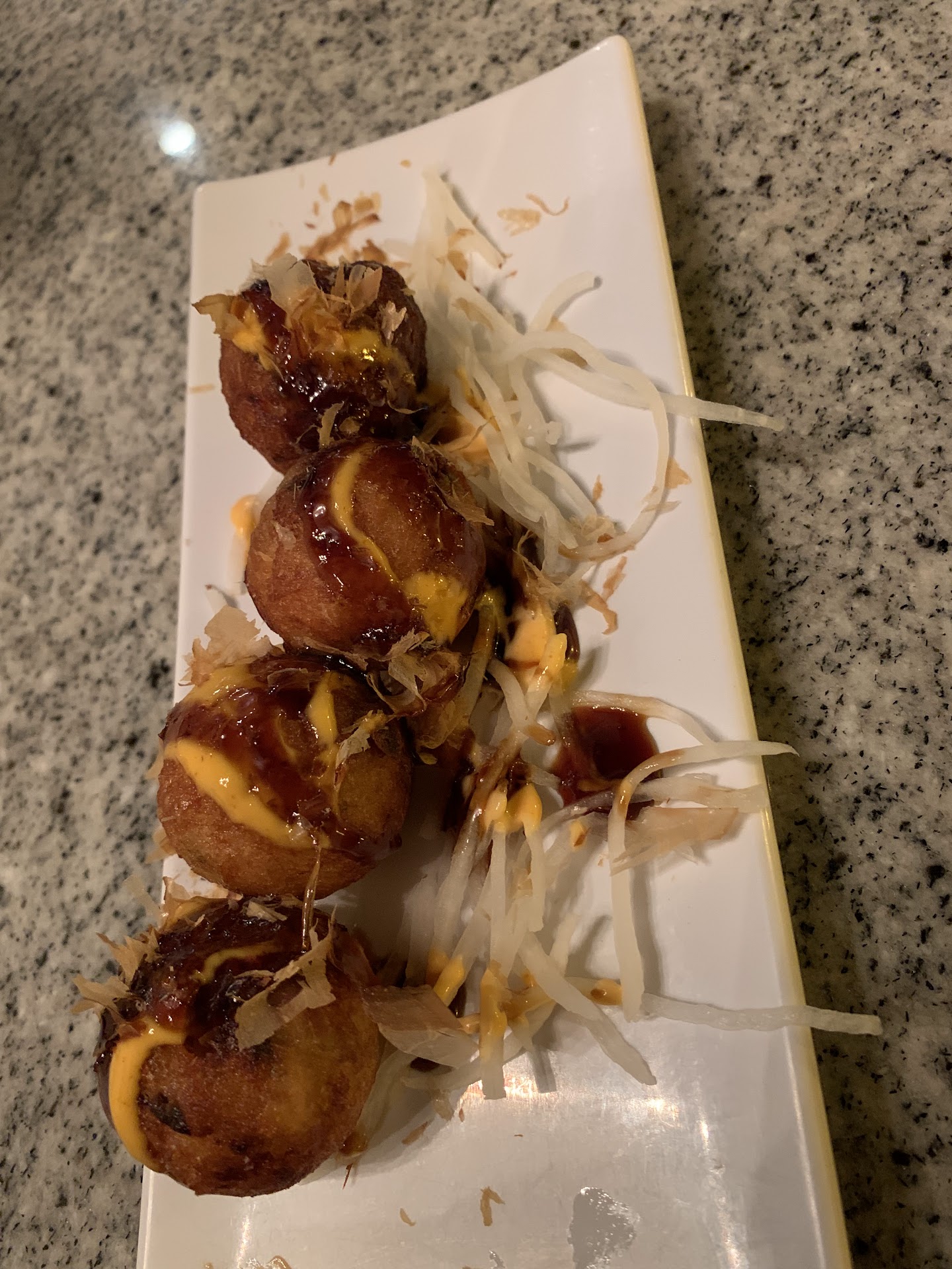 But the sushi is mediocre. This place is the best with their TAKOYAKİ. I would also assume that they are good with cooked food in general. İts probably the only place I had Takoyaki that tasted so good. The dough is flavored and its fried perfectly the sauce drizzle combinations are amazing. The bonito flakes adds a special smoky umami flavor. The octopus is cut bite sized so you donāt have to chew for hours before you swallow it. All the other Takoyakis I tried previously were a mush of dissapointment because the dough was tasted almıst like a salty custard which I didnāt appreciate because I do not like mushy textures. But this restaurant is a winner for me for Takoyakis.