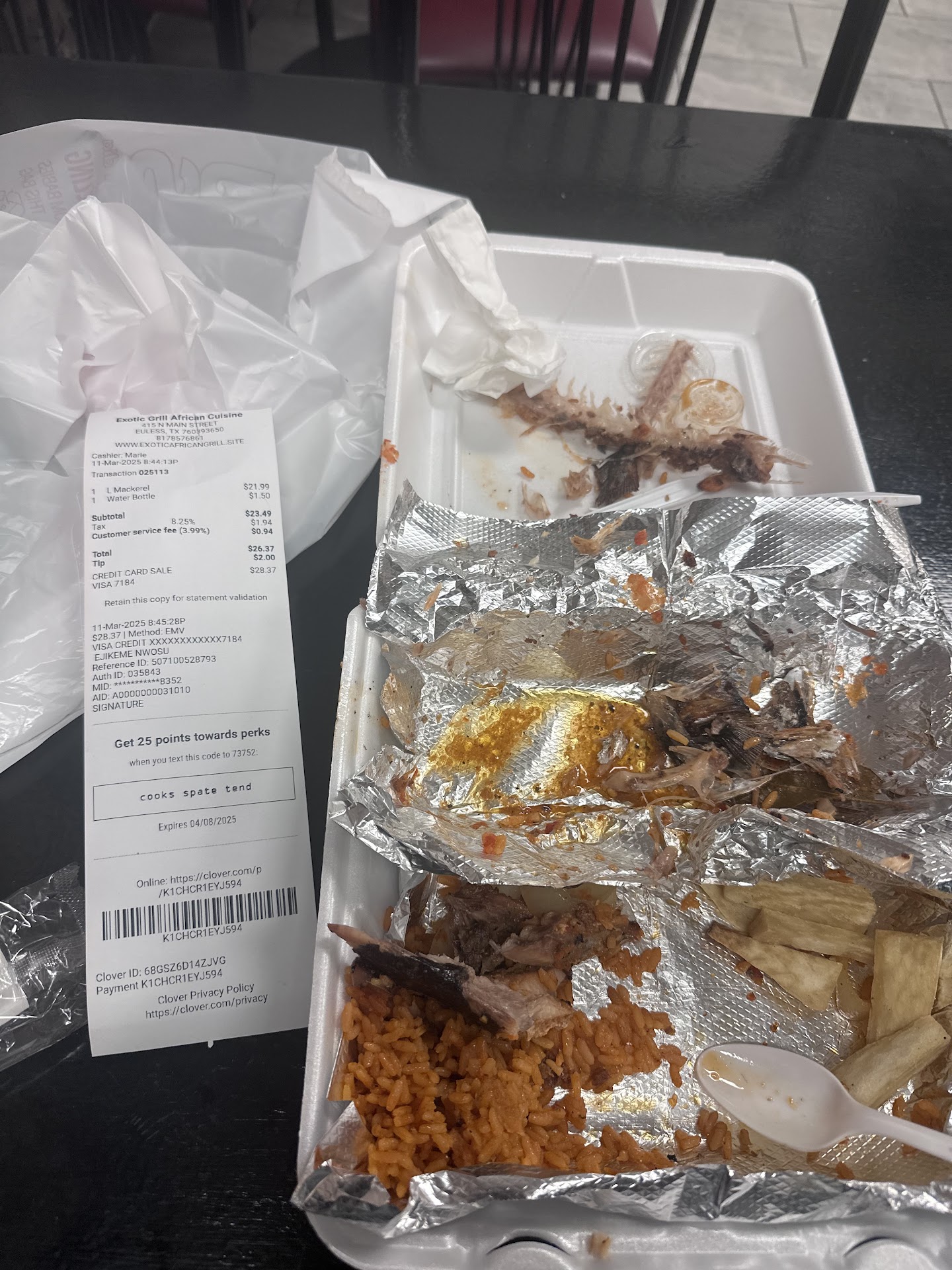 Ā Ā Ā Read moreThis restaurant did not have good customer service. I ordered goat meat stew over the phone and I was told a wait time of 30 minutes. I got there a little after the time. The guy who was taking the orders took the guy order in front of me then he cashed out a guys order that walked up on the right side of me. He then walked to the back I guess to take the order to the cook and walked back out never once saying anything to me. He grabbed 2 plates of food out the refrigerator and a drink and left leaving me standing there. I waited for about 10 minutes then I walked outside to my car to call from my cellphone for the same person to answer to act like she didnāt remember me ordering over 30 plus minutes ago. I explained to her Iām here and I was just standing in the front. Then she goes ok Iām coming. At this point I get out my car and go back inside then she walks out and states give her a minute and I waited then she came out with the food. She then rung my order up asked me did I need a fork I stated yes. Only to get home and open the bag and thereās no fork. Never again will I go to this restaurant and the goat stew...