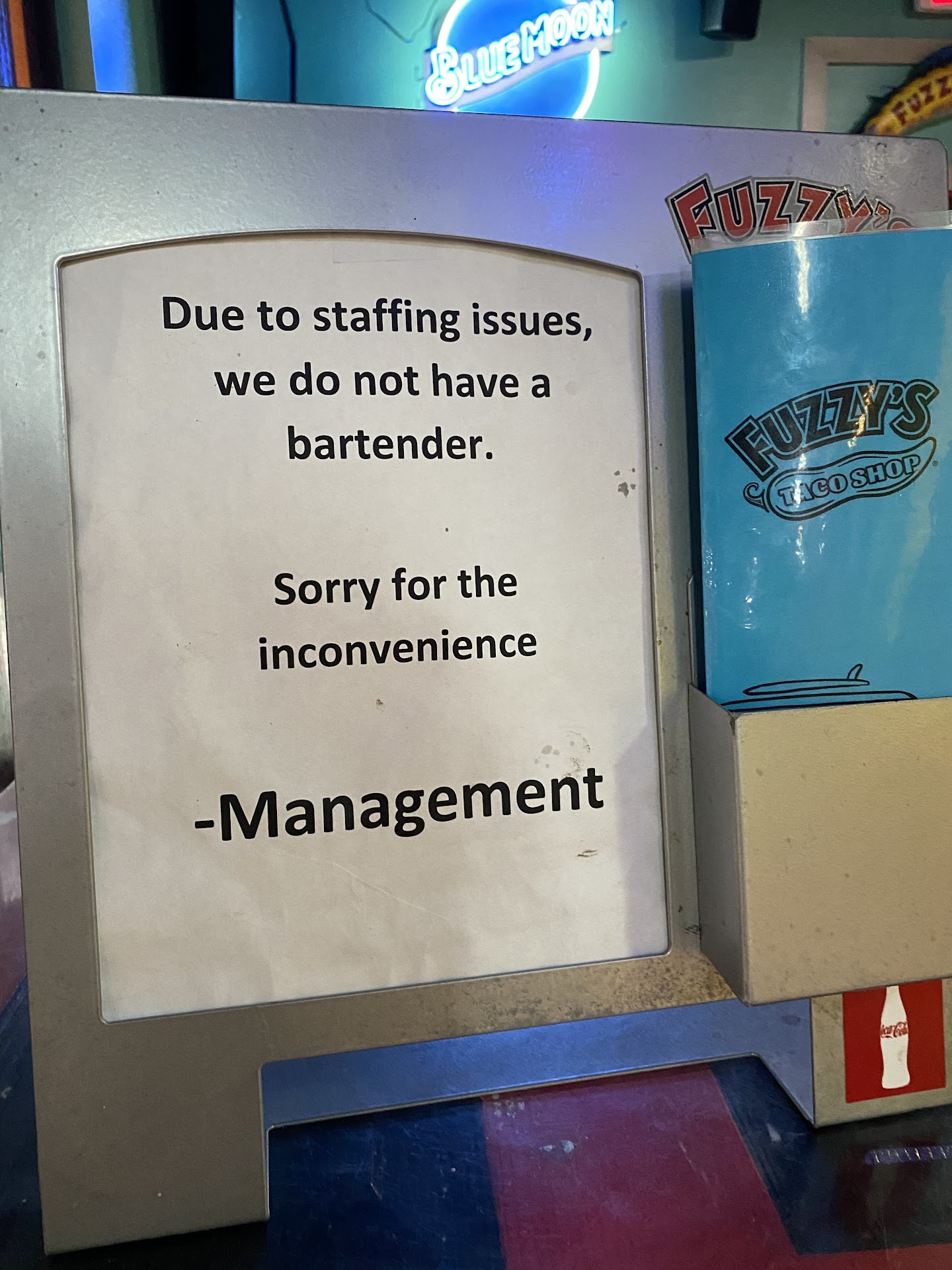 Read moreJust left your establishment . My order was the only food the cook had to make and could not get it right made it wrong the 1st time told her where it was supposed to be the 2nd time she calls me up to the window and still proceeds to ask me after she's got half of it made what all do I want on it it was a simple order a burrito Chicken thigh heater and the vegetables no rice and no beans no sauce how hard can that be. But that real thing that upset me the most and I will never go in that fuzzy's tacos again and I go to fuzzy's tacos all the time but was my 1st time in that 1 was your manager and your employees in a bar part where the TV's are watching the football game jumping up-and-down and swearing and screaming at the top of their lungs I packed my food in left I do not have to hear people using the S word while on eating dinner and screaming at the top of their lungs argued about a football game. And the F word. That was so unprofessional and I've worked food service for a long time . In management positions and I would never do that or allow by employees to be doing this very unprofessional. If there was a way to give minus stars I would I tried to delete off the one star but it wouldn't let me.sorry my order was a burrito bowl chicken and the Vegas no sauce to rice no bean's and sour cream. I said it wrong earlier in the posts. Because I was still Up set when I wrote...
