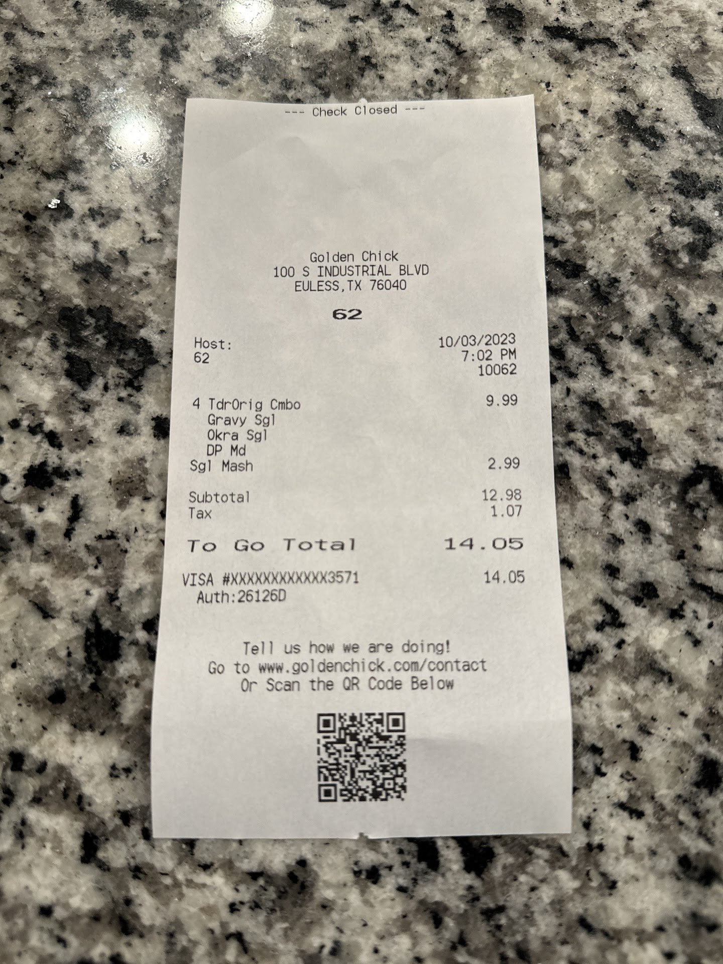 The drink mix was warm, flat, and tasted nothing like what it was supposed too. I ordered dine in and it took 10 minutes, turns out the guy working the counter accidentally put us down for takeout because the drive thru worker brought us our food in boxes tied up in a plastic bag. The tenders were small, I’ve eaten at Golden Chicks all over North Texas and I’ve never seen them that tiny, it’s like they gave me chicken nuggets instead of tenders. I got my meal with dirty rice and it was cold like it came out of the fridge. I brought it to the counter and they offered to replace it with fries, which ended up being just as cold. The drinks came out of the fountain warmer than the sides, and I’m not even exaggerating. There were no spoons or forks or ketchup in any of the holders where they were supposed to be. I know it’s in a gas station, but come on, fast food has been around long enough to know how to make things right. I love Golden Chick more than any other fast food place, and this was an embarrassing display of the quality of their food. If this were the first time I got Golden Chick, I would never...