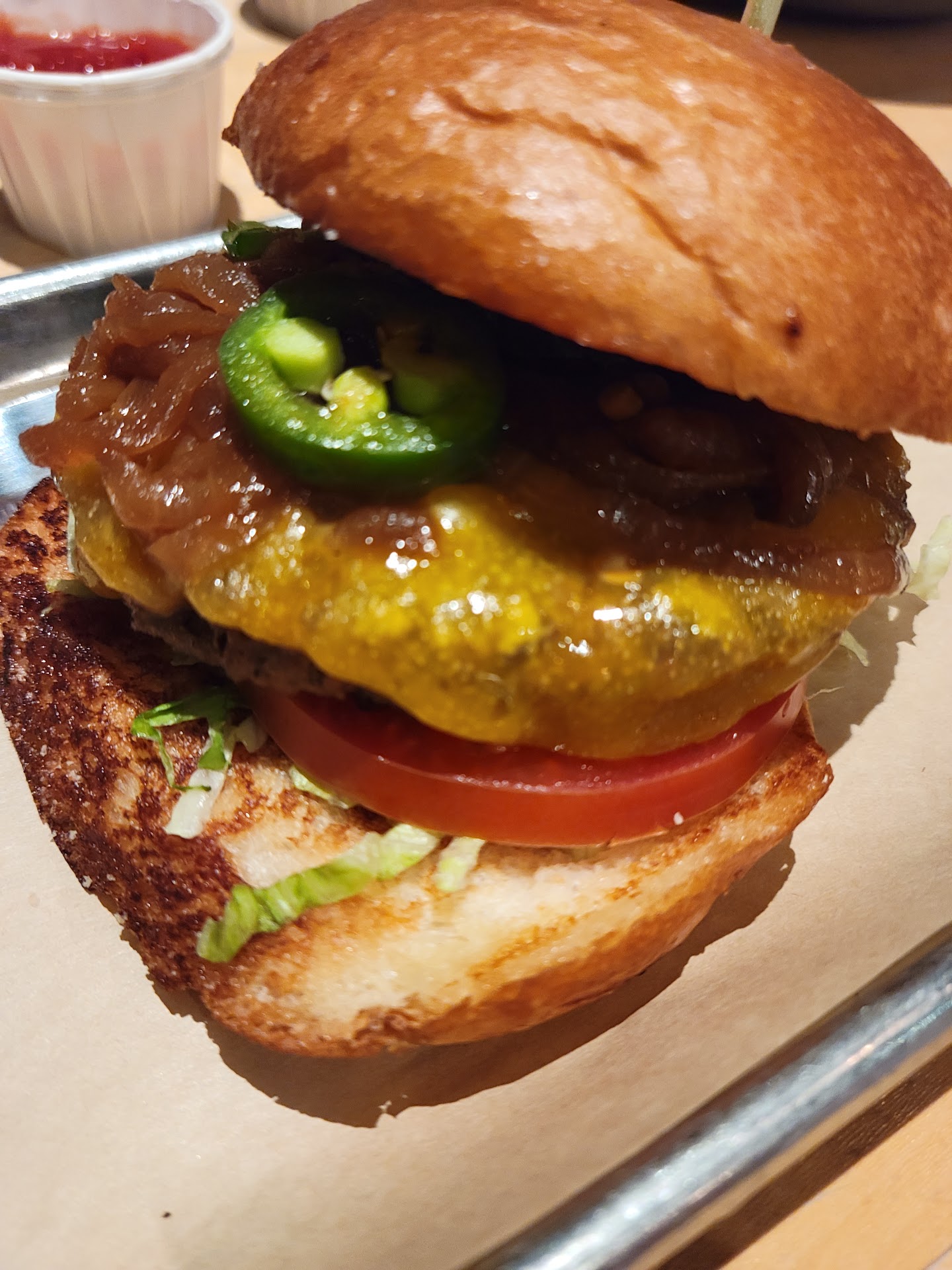 Read moreOrdered online, no clear designation on where to pick up. I kind of awkwardly stood beside the line of people in front of the bar, squeezed through to ask to pick up the order. Took awhile for the bartender and expo guy to bag it up, so I'm thinking it was gonna be hot and fresh. Got home, the Sweet Carolina burger was in fact very salty and very tough. The classic bison burger was good and juicy. The other two burgers we got were ok. We ordered the truffle fries and the green chili queso fries. We got what tasted like 5 hour old shoestrings. Also no green chili queso. Bummer. Along with the cardboard potatoes, the side salad was bagged with all the hot food, I'm assuming this is why it was warm and wilted. It's alright though, because the dressing was AWFUL. Can't quite come up with an appropriate adjective for the taste left in the mouth after that.