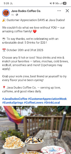 Last night, I saw a facebook post from Java Dudes page about a "customer appreciation" deal, and it said "5 16oz drinks for $20." I was so excited, and texted my coworkers a screenshot and we agreed one of us would pick up the drinks and we'd all only have to pay $4. This is a great deal, considering a coffee here costs $8+ usually. When I got there, they informed me that there was a typo on their post last night, and the sale was only for 4 drinks. I showed them my screenshot of the post from 5:26 pm the night before where it said "5" drinks TWO separate times in the post. They said it didn't matter, and that I would have to pay full price for one drink. They charged me $30 (that's $10 for one of the drinks, as opposed to the $4 we expected). I reached out to the owners on facebook messenger and explained the situation, and sent screenshots with timestamps to prove that the post did say 5 drinks last night. I was respectful and wanted to bring the situation to light so the owners could know what happened and I wouldn't be leaving a damaging review.