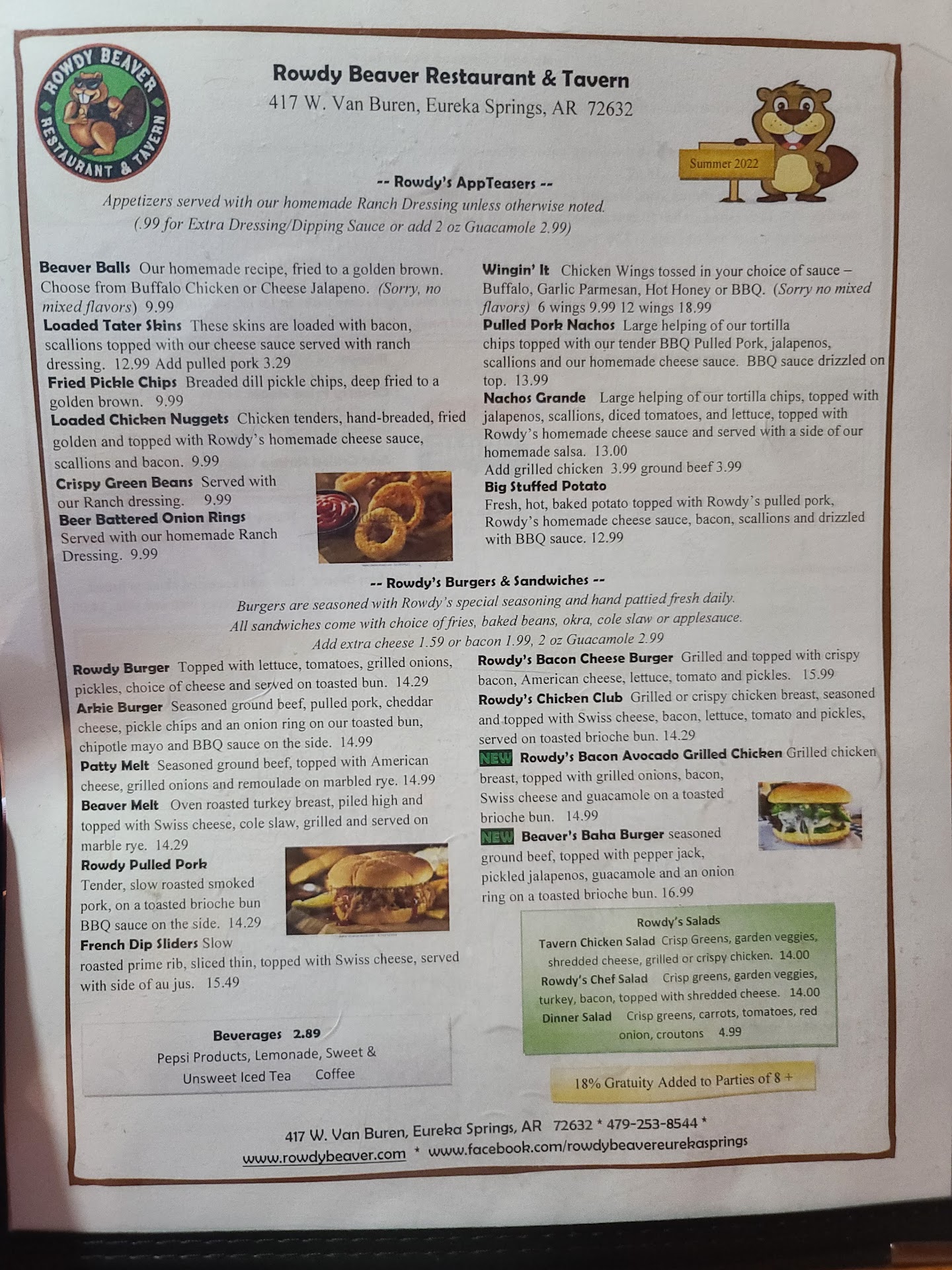 Read moreI was kind of excited to have dinner at the Rowdy Beaver Restaurant on route 62, purely because I liked the name. So we went on a week night in June,2023. We were seated quickly. We found that there is not an over abundance of room at the tables we were seated at. It actually effected the table next to us because there wasn't enough room. Now I know I could loose a few pounds, but that was not going to help. We ordered our food and that was the last time our server was at our table. Well until she brought the check. We watched her making the rounds. Just not near us. Someone else brought out our food. I could tell that this restaurant was definitely understaffed. While we were waiting, the wife used the restroom. She said that the design is poor at best. And it reminded her of a barn, but that was part of the decor. She said she had to put her purse around her neck to sit down. And there were other design issues pertaining to those things. The stall door had multiple issues. So our food comes out. It looked good. My entree' was hot and looked good. My two sides were both Luke warm, bordering on cold. One side tasted good and I ate it even though it was basically cold. The other side and the entree' had little to no flavor. I cannot believe how much salt and pepper I put on my dinner to give it some flavor. The wife said her's was basically the same. But she could not use a lot of salt to mask the lack of flavor. It was a shame because I was so into liking this place. Neither one of us finished our dinners. Although I did finish my soft drink. The decor was decent and kind of had a log cabin type of look going on. I found it nice and enjoyed my dinning experience in that regard. They had a little gift shop neat the entrance. As well as a store and bar adjacent to the restaurant. Anyway, we paid our check and were on our way. Now I don't want to say it was bad, because it was not. We just seemed to have an issue with the flavor of our dinner when we were there. So maybe consider trying it for yourself and decide. If anything it has a good name which made me wan to be there...