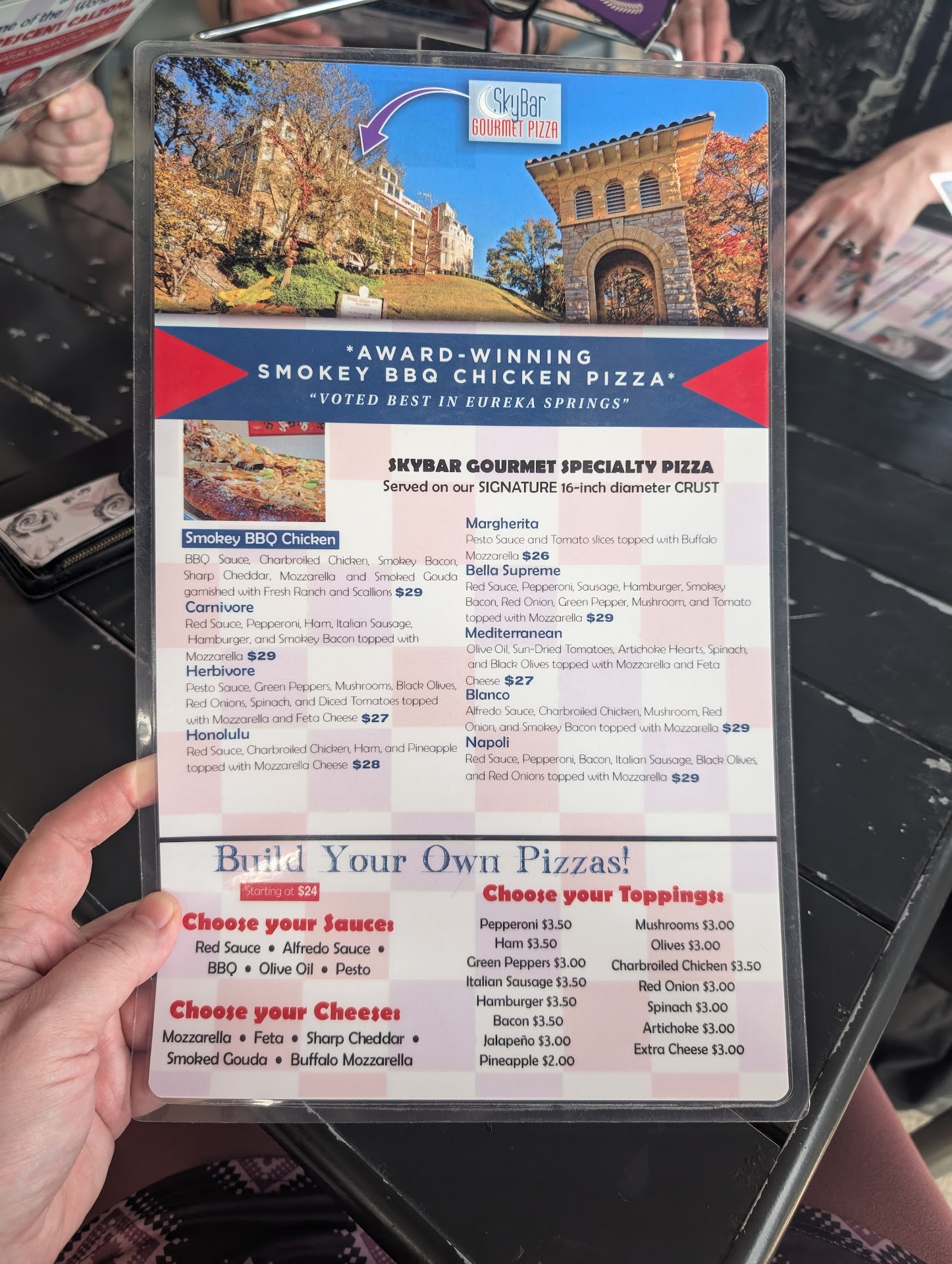 Once upon a moonlit night in Eureka Springs, I embarked on a noble and cheese-fueled quest to reclaim the glory of a calzone I had once tasted—not even fresh, mind you, but in the form of leftovers passed down to me from my lady, who had moved to this whimsical mountain town to reign among fellow musicians, writers, artists, ghosts, and eccentrics. She had sung tales of this calzone. Rich in cheese. Overflowing with meat. Cradled in soft, pillowy bread that could have been baked by woodland elves with access to an Italian grandmother. And I, having tasted a bite reheated, knew I had to claim my own fresh one. My excitement was at an all time high to pay $30 for this calzone. Or so I thought. We ordered the very calzone that had lit up my dreams a couple nights before, that sat for 24 hours and then was nuked for warmth. But alas! I ordered my very own fresh one. The kitchen, however, seemed to be forging it in the fires of Mount Doom. As we waited... and waited... and waited, my lady began to fade. I, too, was descending into a hypoglycemic spiral, seeing visions of marinara waterfalls and mozzarella rivers glowing in the beautiful outside seating under the moon. After questioning if we should check on our order, my lady suddenly rose from the table to politely inquire on the status of our order to keep me from hurling myself over the 4th floor balcony from hunger. She has been a server in the past, she is very aware of the goings on in restaurants, and is quite empathetic to the challenges, but at this point patience had failed us. Our server returned shortly thereafter with a charred bread tractor tire and announced… "It looks burnt but it’s not." Unless Smaug is taking a vacation from the Lonely Mountain and helping in the kitchen then this calzone had lived a full and tragic life in that oven. It was burnt. And to add insult to injury, it came to our table uncut and lacking all resemblance of a healthy and happy Calzone. Our server said the kitchen accidently put it in a to-go box, so she took it out of the box and brought it to us. This was an obvious clue of why it took so long to get our food, for it had been sitting under the heat lamp in a box waiting for someone to pick up the to-go order that was never placed, for who knows how long. So instead of correcting this situation which we figured out by deduction of logic and away from the kitchen area. She instead served it to us with a hint of truth and a steaming pile of lies. We attempted to cut into the cursed calzone, but it fought back! What was inside? A barren cheese wasteland, and clumps of meat that no one bothered to spread evenly as one would normally on a pizza or sandwich pizza commonly known as the calzone. This was the ghost of the gooey glory I had experienced in leftover form. My dreams were crushed, and in its place stood only sadness wrapped in a crust that will haunt me forever. I am only able to describe this pile of regret because we were so ravenous and it was beginning to affect our relationship, and we both decided love was more important, so we ate to get our blood sugar up and we moved on trying to understand what just happened and what we just consumed. When we gently informed the server that this was not the same glorious calzone from days prior, we were met with the kind of indifference typically reserved for the DMV line. Complete with hands on the hips and feigned surprise that we would know the difference. Perhaps she assumed we were tourists, but we are locals and knew what to expect. Which begs the question, is this how tourists are treated at the sky bar on a weeknight, or possibly just a tired overworked server and kitchen staff on this particular night. Something to ponder for management. And then, the glorious check arrived. Smacked down with the grace of full blown, thinly disguised annoyance, and bore upon it the true twist of this horror story: an automatic 18% gratuity. With no foreshadowing of said policy. For two people! Is this the penalty for a couple that wants to eat after 8pm on a weeknight in...