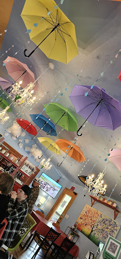 What a cute place. The atmosphere is so cheerful and positive. The ceiling is decorated like it has clouds with an assortment of colorful umbrellas hanging. Just looking up brought a smile to my face. This place is a combination of a restaurant and a small store.