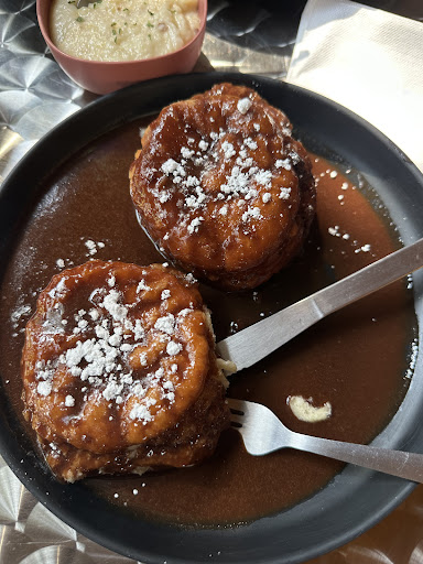 My partner unfortunately has to be gluten free. He was able to order a basic breakfast and choose a GF toast. They kindly put butter, cinnamon, and sugar on it for him as they were unable to make him french toast from it. They serve it with a smoked gouda grits and I must say they are some of the best grits we have ever tasted. The gouda was a very prominent flavor with some hints of pepper. Surprisingly good.