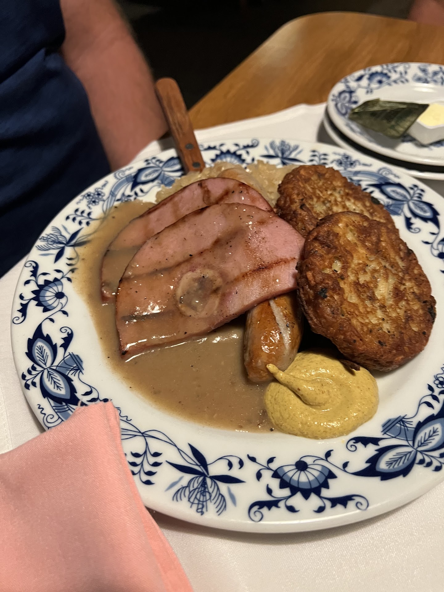 The food was phenomenal. My husband got the jager schnitzel, my 11 year old son got the rainbow trout, and my 13 year old daughter got the steak Madagascar. There is a charge for an extra plate, so, knowing my family, I ordered a side of two potato pancakes, and that got me a plate that I could use because the was NO WAY the kids were going to eat all their food, and I had doubts about my hubby. Besides, it all sounded so good, that way I didn't have to choose. It's a very good thing I didn't, because I honestly couldn't tell you what was my favorite. The steak was so good it made you thankful that God created the cow. The same could be said respectively for the trout and the schnitzel, though, so you couldn't really go wrong. (Yes, the potato pancakes are good too. They just needed a touch of salt.) We did order dessert. We got the apple strudel, explaining to the kids that this was a Czech/German restaurant, so we were not going to get the Tiramisu, no matter how good it sounded, because the strudel would be more culturally correct. Y'all, trust me. You have room for dessert. We still brought home a few left overs, which means we normally wouldn't have ordered it, but... you want to have room for the strudel. Jennifer was our waitress this evening and she was a lovely young lady. She was very attentive and I don't believe any of the drinks were ever empty before we were getting refills. The service was as fantastic as the food. We wouldn't be able to splurge on this often, but my "let's order pizza" teenagers have asked that when we can, we do. Even if it means giving up pizza for a while. Well done...