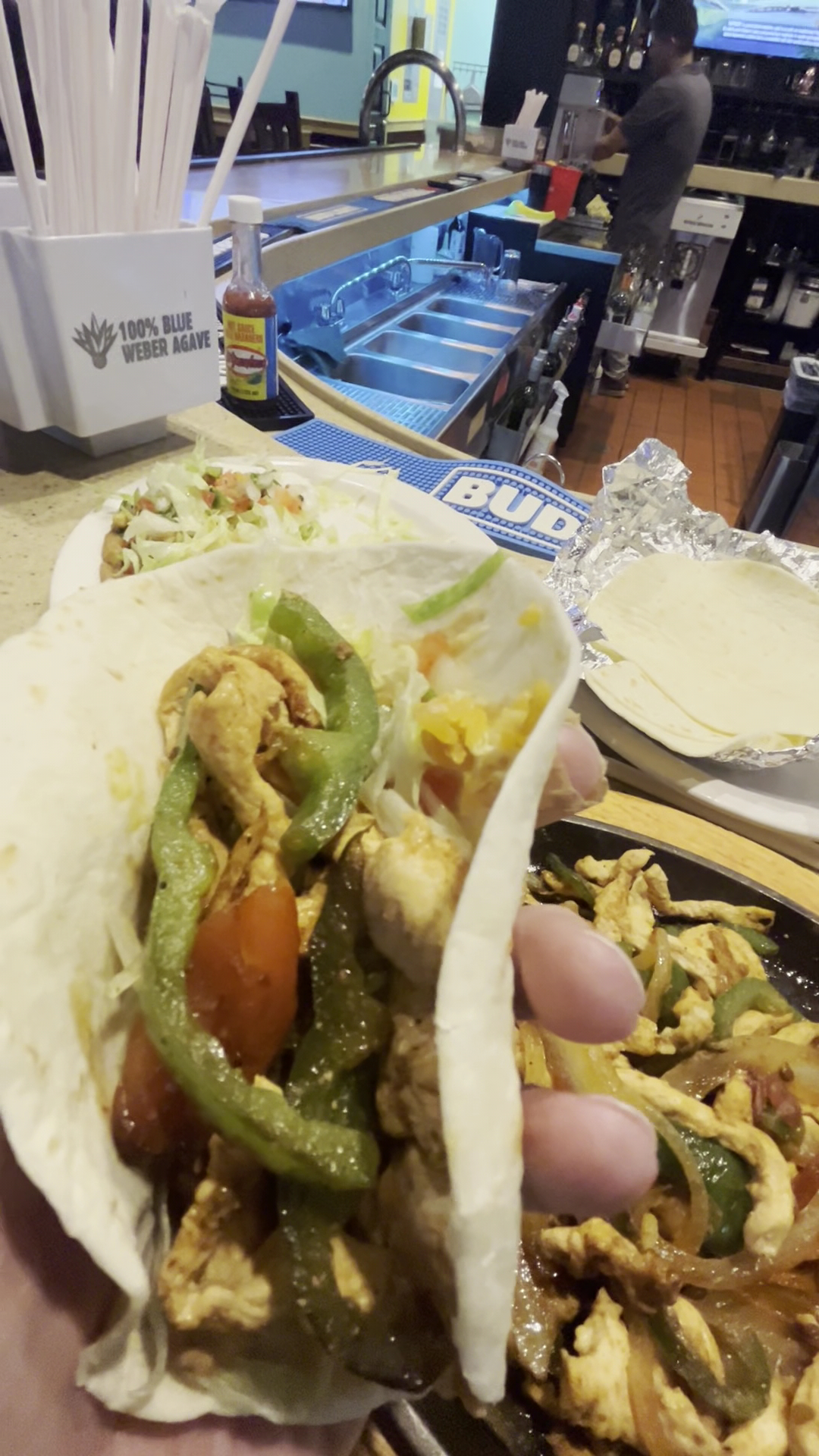 Food took over 20 minutes (?) the sides for the fajitas were brought fjaitas had large slices of tomato (not cubed) had 5 shrimp and maybe 1 oz TOTAL of chicken & steak burritos had many chunks of the peppers