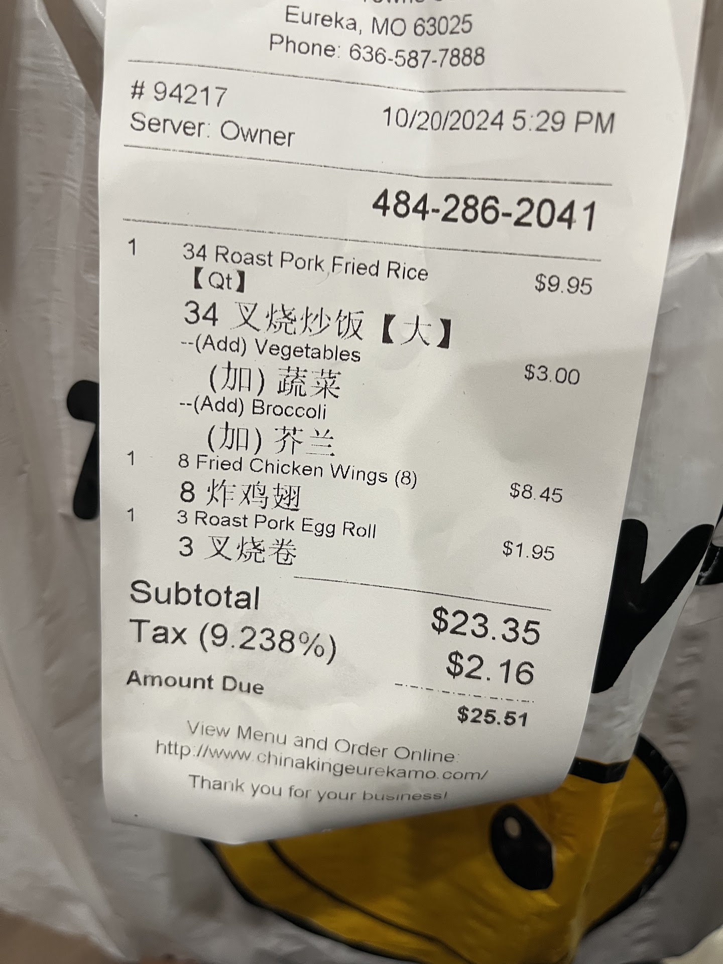 Edit: Got home and realized that the reason the price was so high is that he charged me for a quart and I definitely did not get a quart of fried rice. I got MAYBE a pint but its hard to tell in the container I got. Its a pity coz the food is good, the...