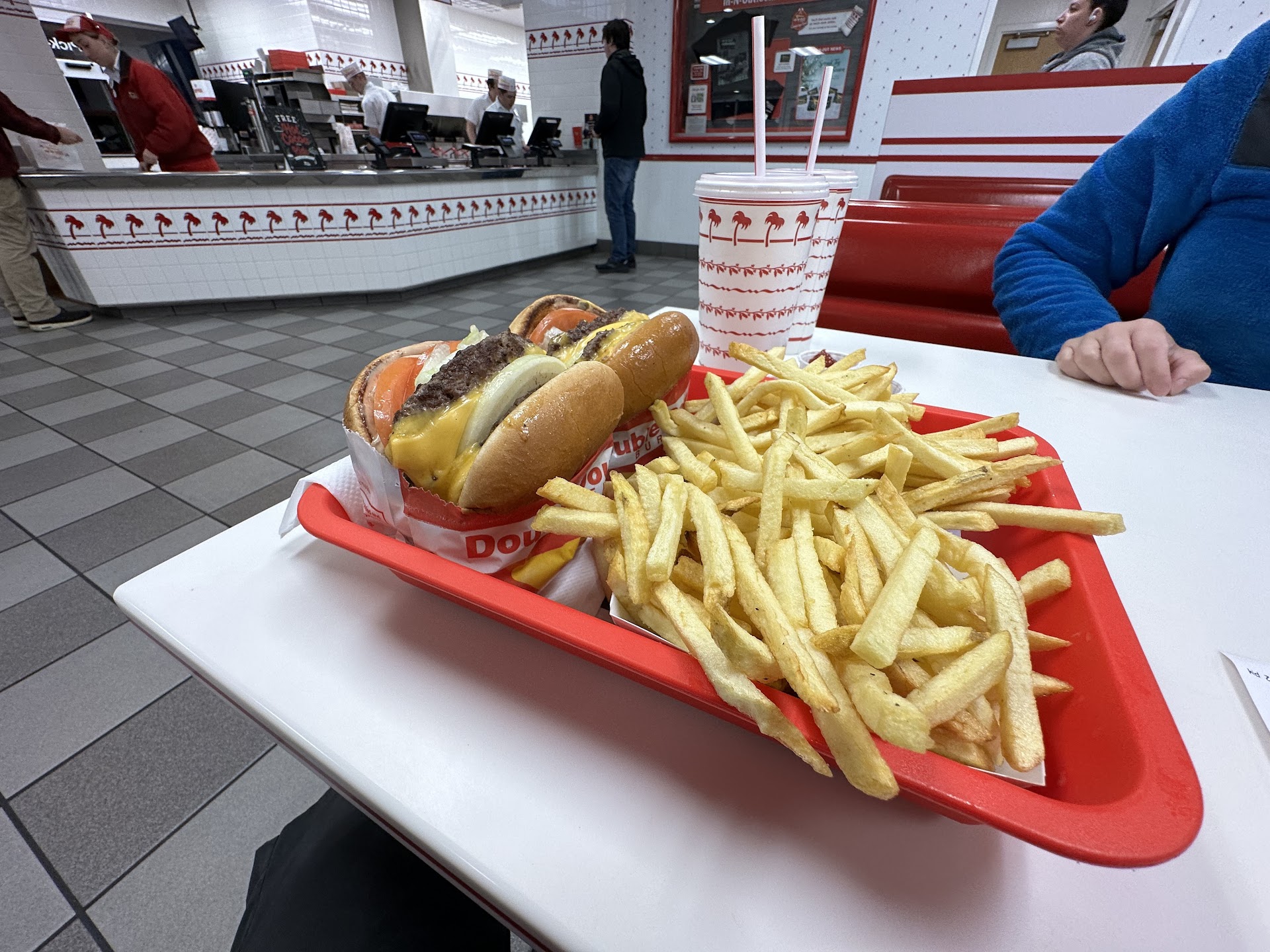 Read moreIf you're looking for a quick bite to eat, In & Out is the prime spot to go. 5 stars on their customer service. All the workers are exceptionally kind, especially considering they go through hundreds of unique interactions every day. They only do burgers, and they do them very well. In & Out is quick, simple, and delicious. As far as their food, they cannot even be compared against the other fast food burger joints around. They're that good. All the burgers are 100% beef, cooked to perfection. Their specialty "Spread" sauce is a delite and comes with all the burgers by default. Their fries aren't the best in the world obviously, but for having to whip em out fast they are very good quality. Made in-house with fresh potatoes. I personally recommend the Animal Fries. It's their fries, topped with Spread and grilled onions. Best ate with a fork, every bite is heavenly. To wash it all down, they've got fountain soda and milkshakes. The milkshakes are very good. To top all of this off, their food and drink is so fairly priced, I will never find myself going to McDonald's or Burger...