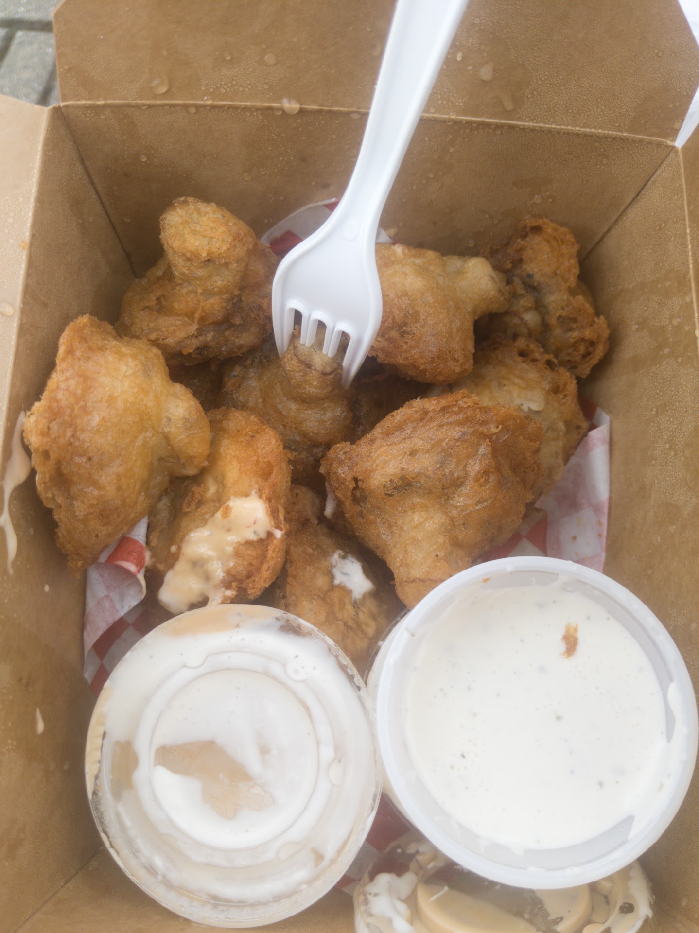 Ordered fried mushroom appetizer in the form of an ala cartĆ© togo lunchy/snack-type situation. The batter was appropriate to the vegetable being fried and sufficiently coated the lil' mushies. The sauces were PLENTIFUL and varied. All told, the amount of saprophytes served up equaled exactly 9. Approx 180g average cost =1$. The number of ramekins filled with sauces equaled 3. Approx 5oz total (Chipotle mayo and Ranch) $= +/- .50. The improvements that I can see as being needful are: The mushrooms before being battered and abused/fried need to have their stems re-cut, as time turns these initial "harvesting" cuts at the foot of the shrooms somewhat woody, and frying this tougher piece of the stalk inside a battered shell along with some resident moisture from the mushroom itself lends to the "foot" of the mushroom texture and tooth of a slimy scabš¢(sad face). The mushrooms were cooked perfectly, thankfully. As any variances in temperature can ruin the tender fellas. There were 9 individual fried fungal reproductive parts in my order, which came to 10$(menu price, 13$ including tip). And I always add the tip to the total on the restaurants end. As the only reason tipping is necessary is because restaurants are still paying floorstaff minimum wage, when they should've raised pay rates commensurate to cost of living/inflation increases rather than put the burden of care on the public, their customers. But that's what the masses are for; carrying the burden of budget cuts, and rising rates so that the profit margin may stay somewhat stable, and knowable. (I wish I would've been asked first š)