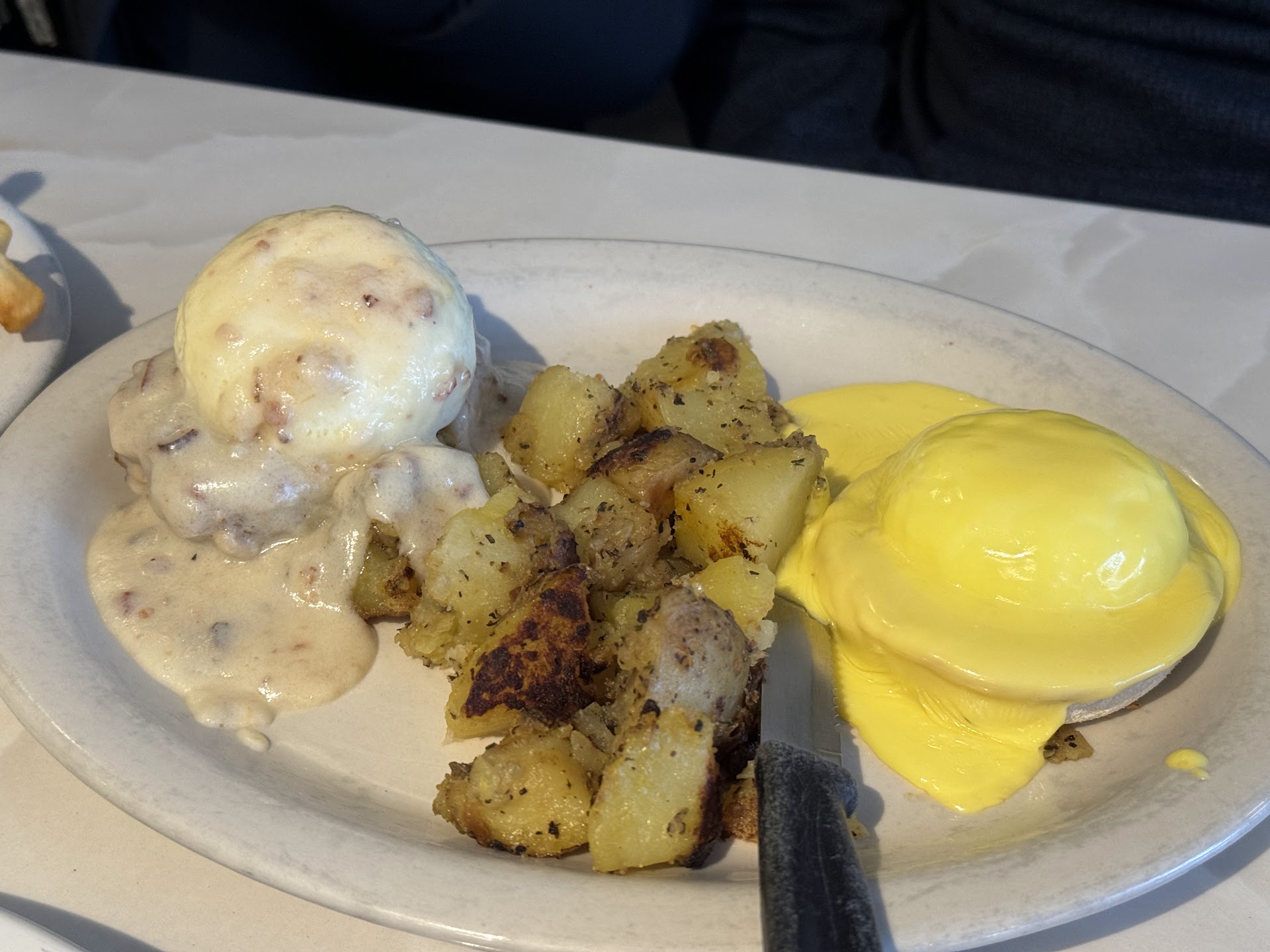 Now, let's talk about the main event – the food. I ordered the country fried steak and my go-to breakfast choice, eggs Benedict. The fried steak was, well, average – nothing to write home about. But the eggs Benedict? Let's just say they were more 'hard-boiled detective' than 'runny yolk artist.' The lack of oozy yolk was a bit of a letdown for an eggs Benny aficionado like myself. However, the gravy was the unsung hero of the meal, saving the day with its flavorful charm.